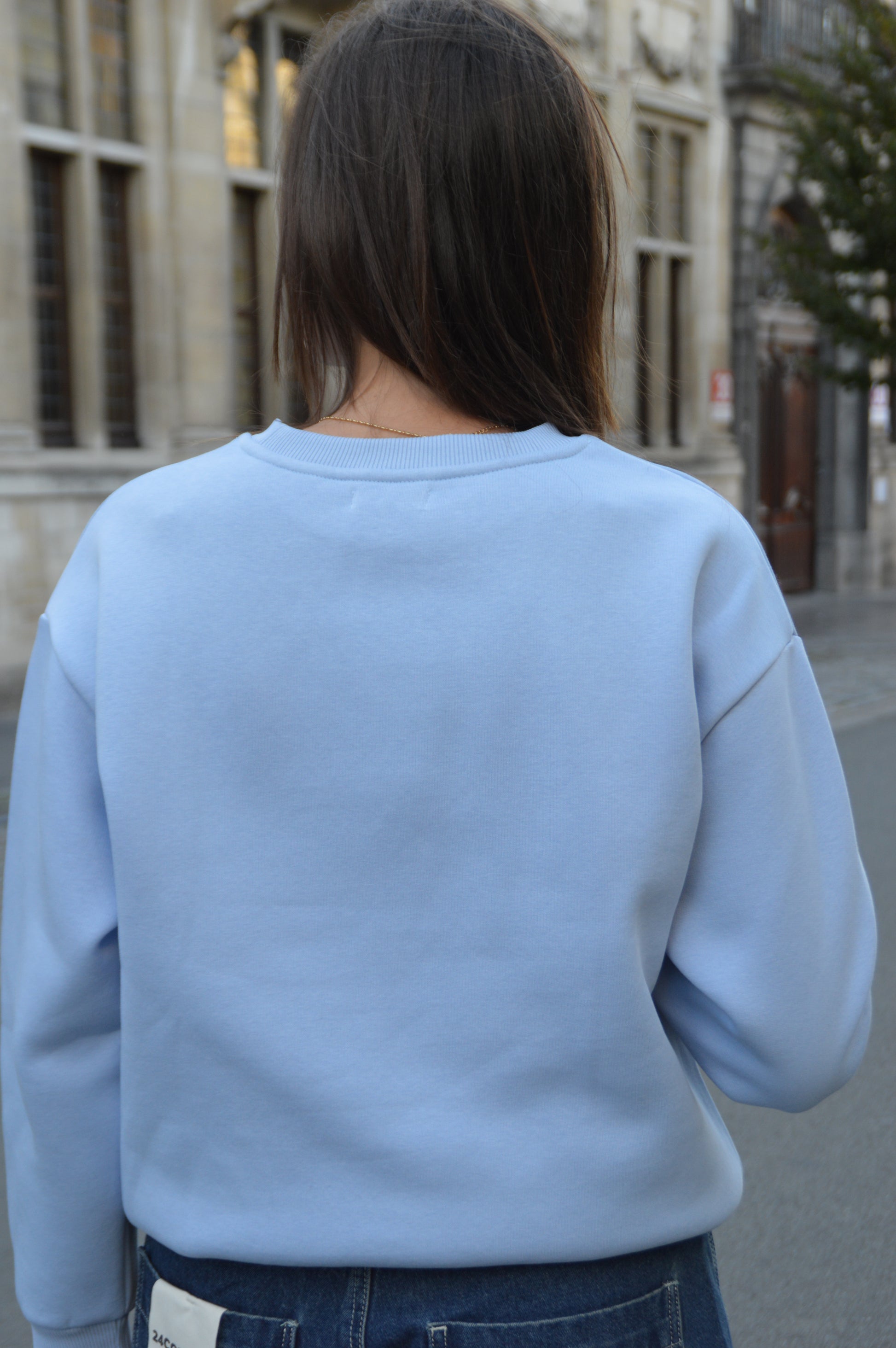 Lichtblauwe sweater met witte opdruk. De trui is vanbinnen gevoerd en dus super zacht en warm.