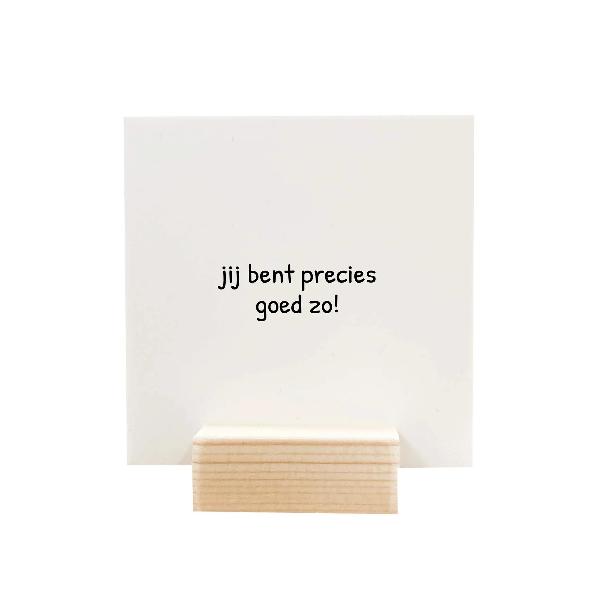 Je ontvangt één houdertje, gemaakt van duurzaam hout, met daarin een stevig Forex bordje van 9 x 9 cm.