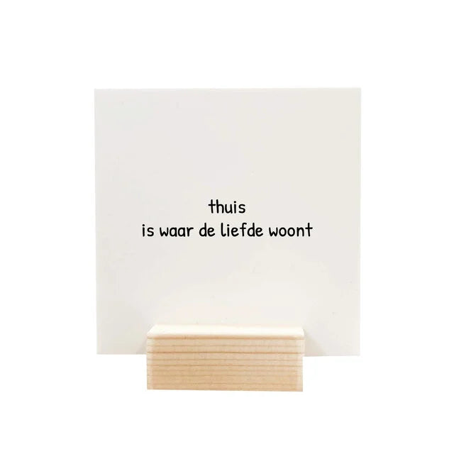 Je ontvangt één houdertje, gemaakt van duurzaam hout, met daarin een stevig Forex bordje van 9 x 9 cm.