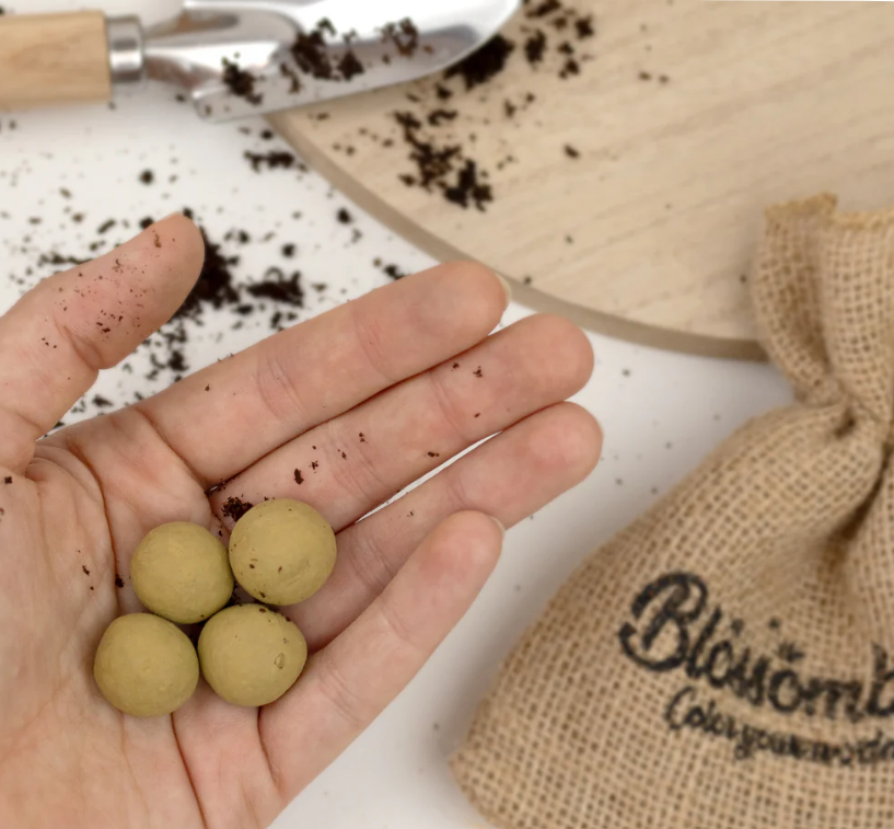 Blossombs zijn biologische bommetjes vol wilde bloemzaadjes. Ze zijn gemaakt van natuurlijke materialen, waaronder klei en vezels. De bloemen die uit de bommetjes groeien zijn speciaal uitgezocht voor de bijen en vlinders. Zij kunnen onze hulp namelijk goed gebruiken! Blossombs hebben weinig verzorging nodig, maar zorg er wel voor (als moeder natuur dit niet doet) dat ze genoeg water krijgen. Het beste kan je ze aan het begin van het voorjaar ‘zaaien’, zodat je er 2 seizoenen lang van kan genieten.