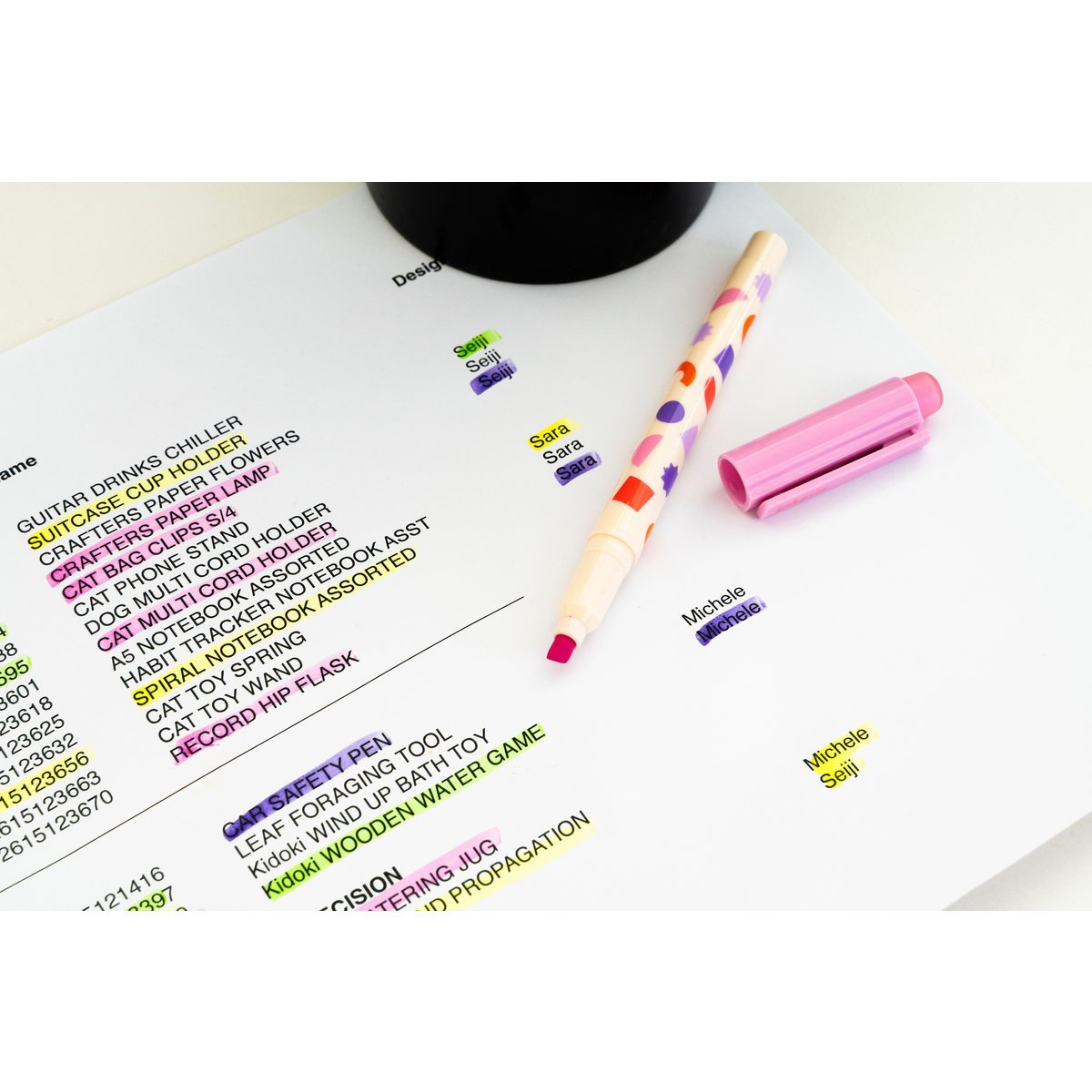 Markeer met precisie! Deze kleurrijke markeerstiften hebben dunne punten en verbazingwekkende uitwisbare inkt, zodat u uw werk altijd netjes kunt houden. Set van 4 markeerstiften met roze, paarse, groene en gele inkt.