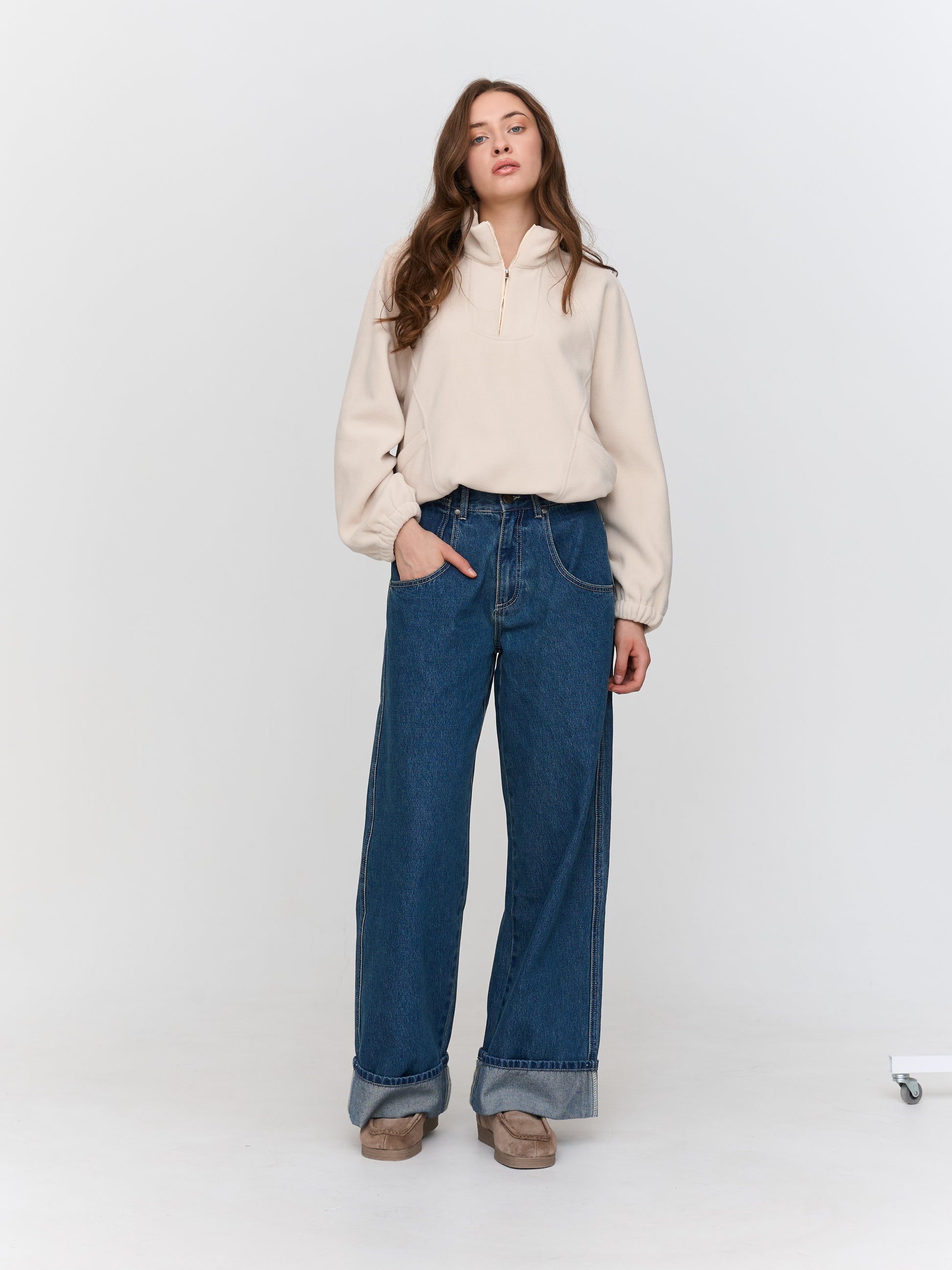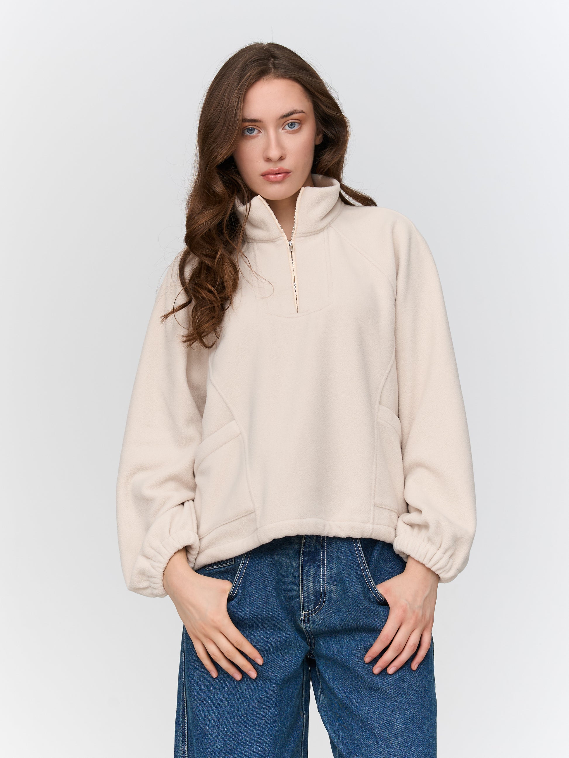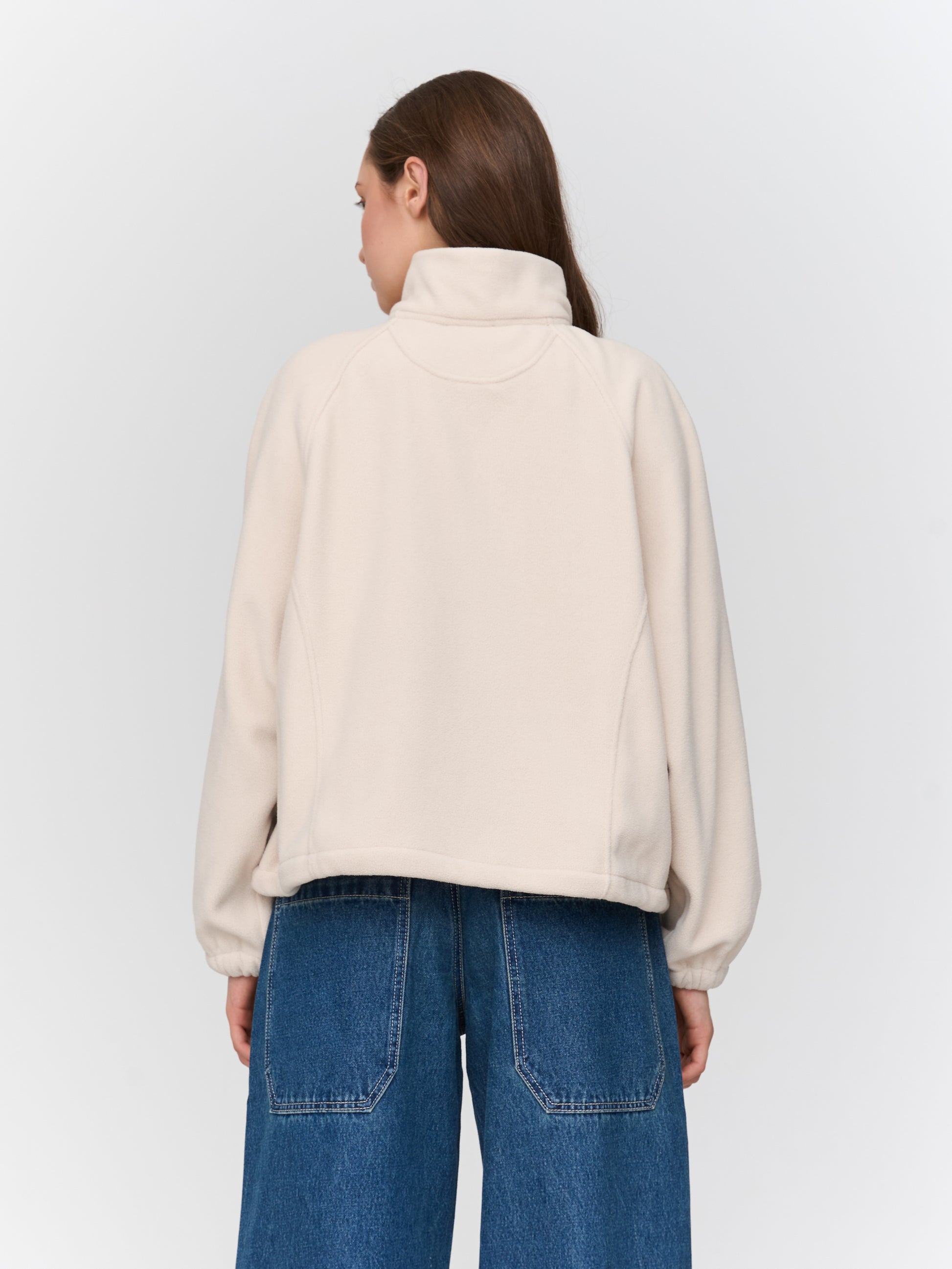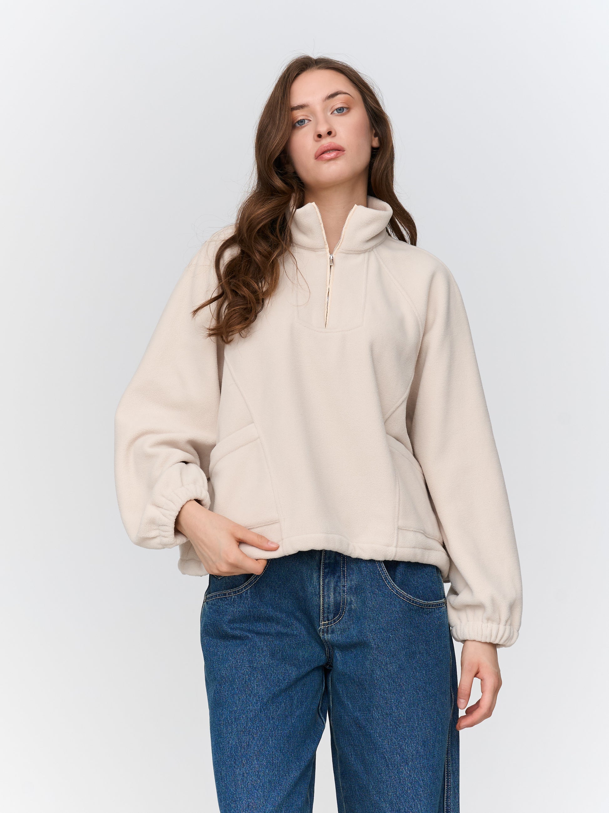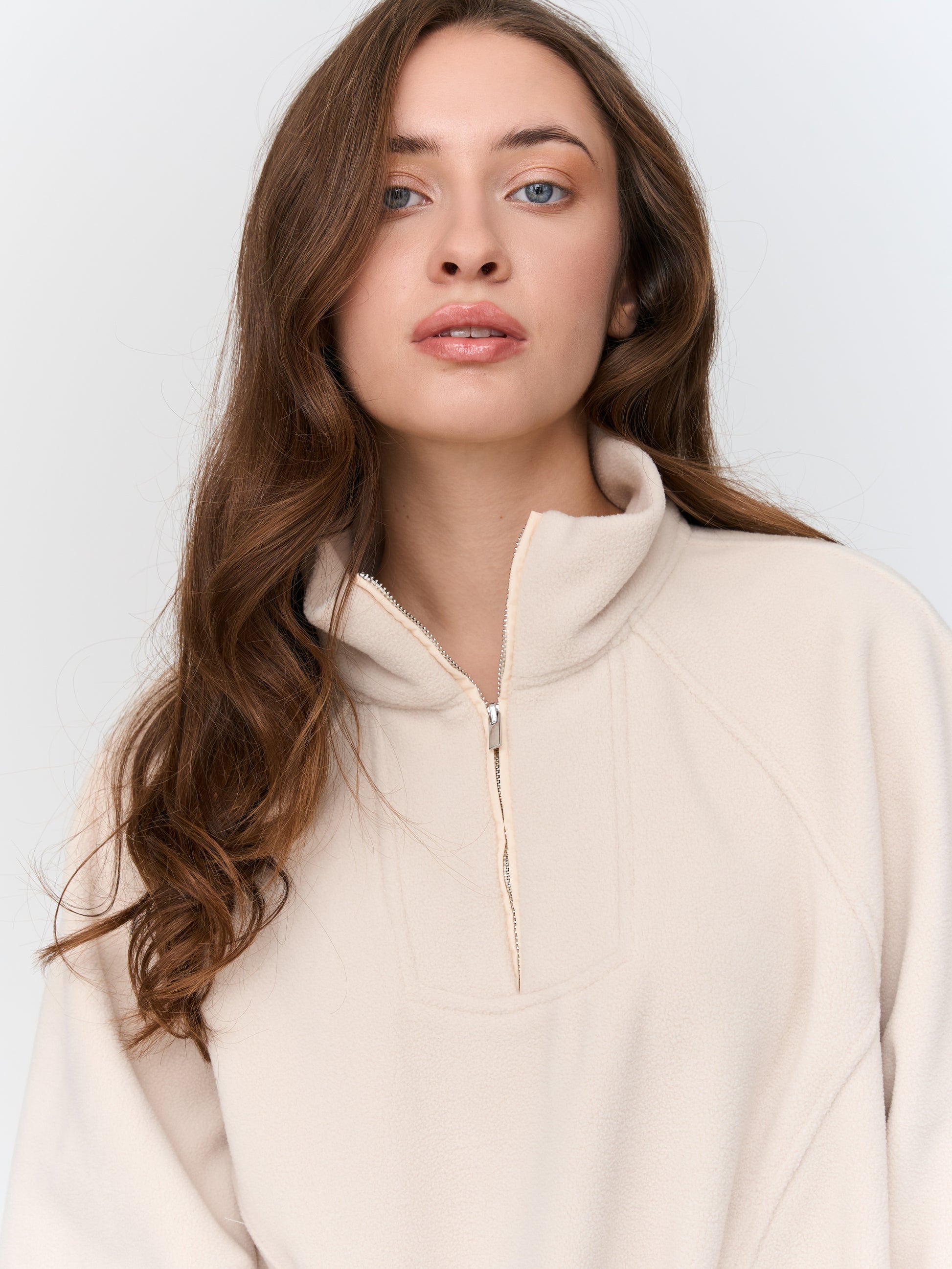 Gebroken witte fleecetrui. Oversized model, maar je kan het aansluitender maken dankzij de rekkers onderaan en aan de mouwen.