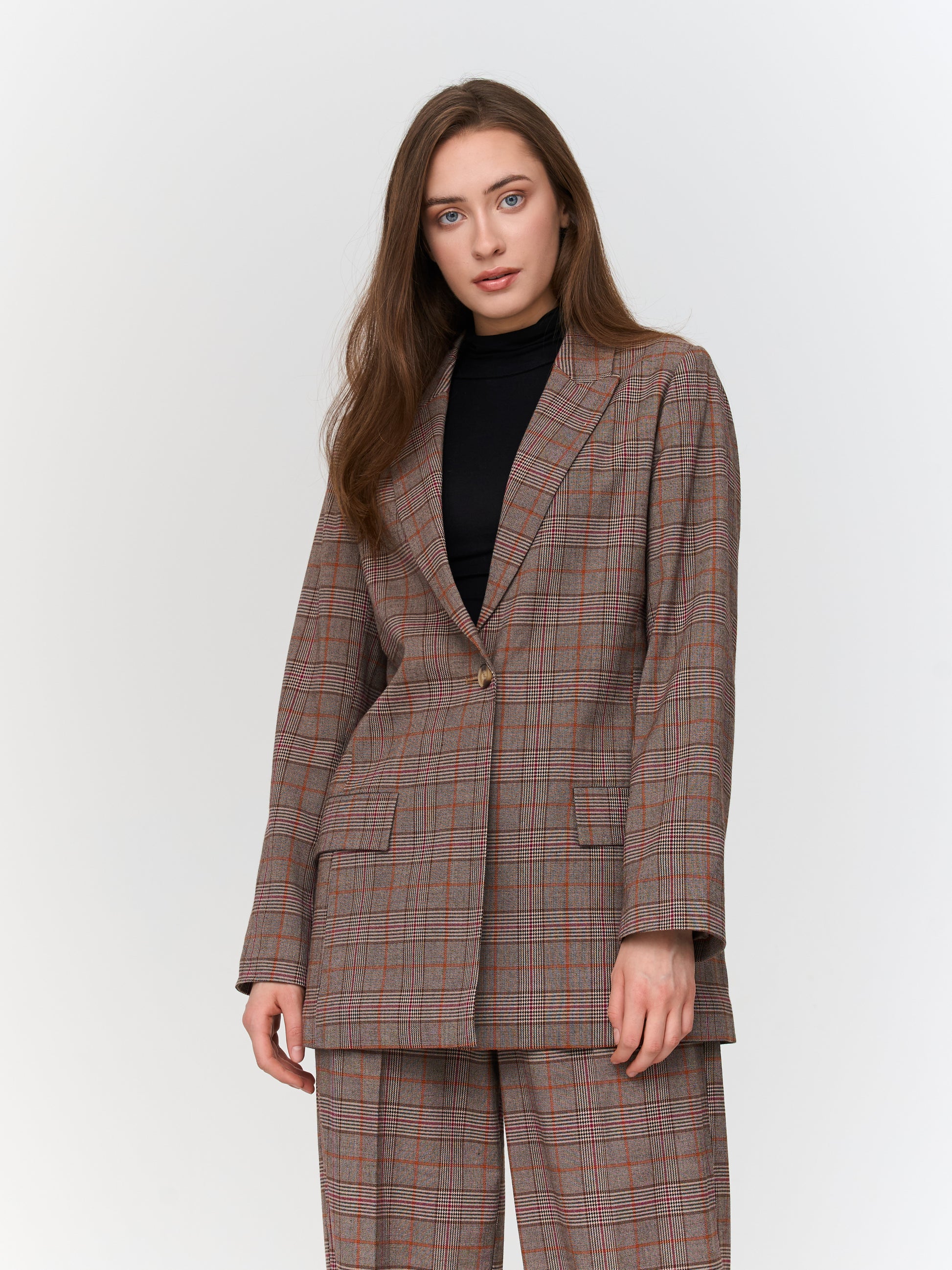 Oversized blazer met geruit patroon. De blazer is bruin en heeft witte, bordeaux en roeste streepjes.