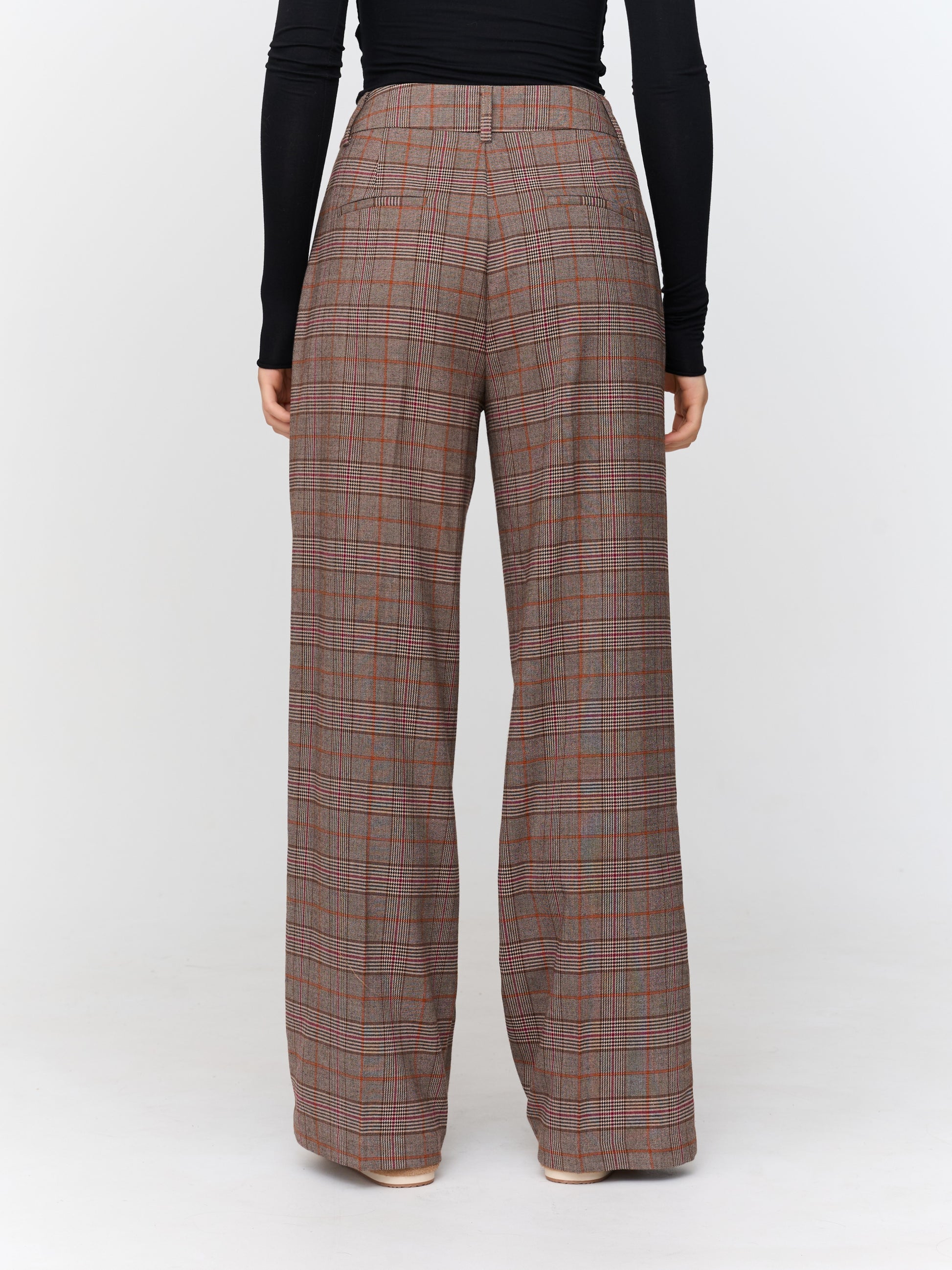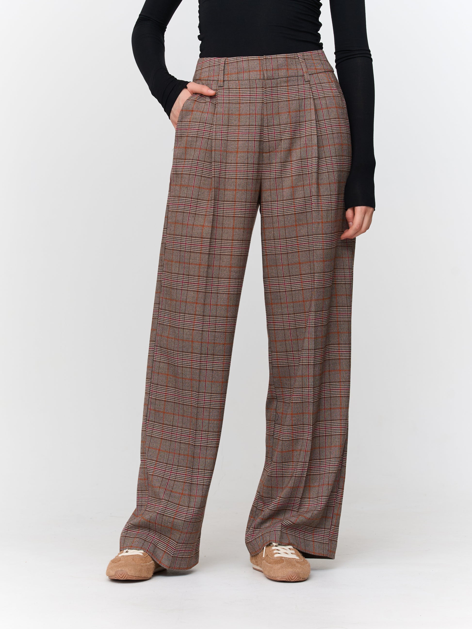 Broek met geruit patroon. De broek is bruin en heeft witte, bordeaux en roeste streepjes. De broek is niet op rekker en valt recht naar beneden.