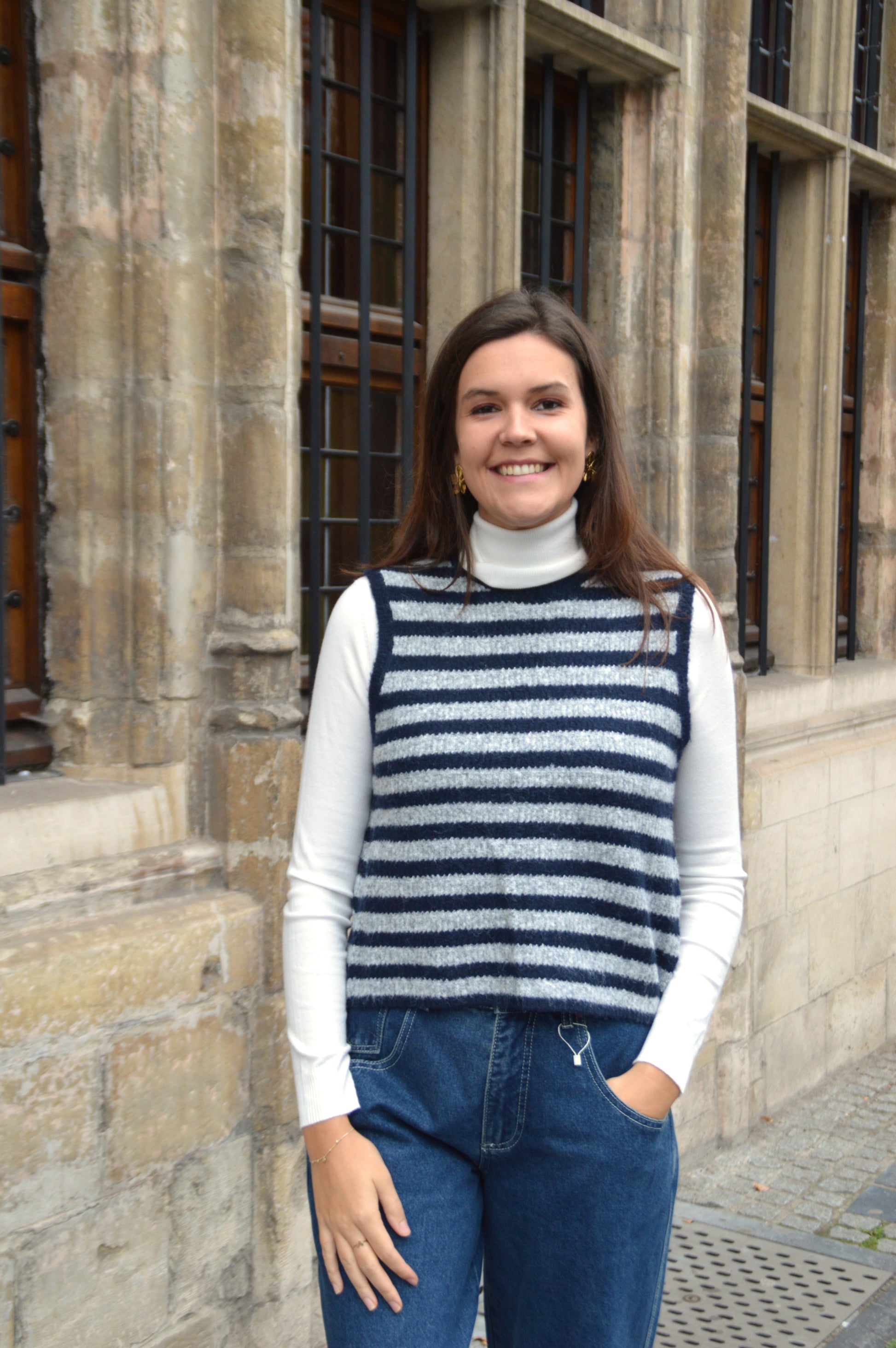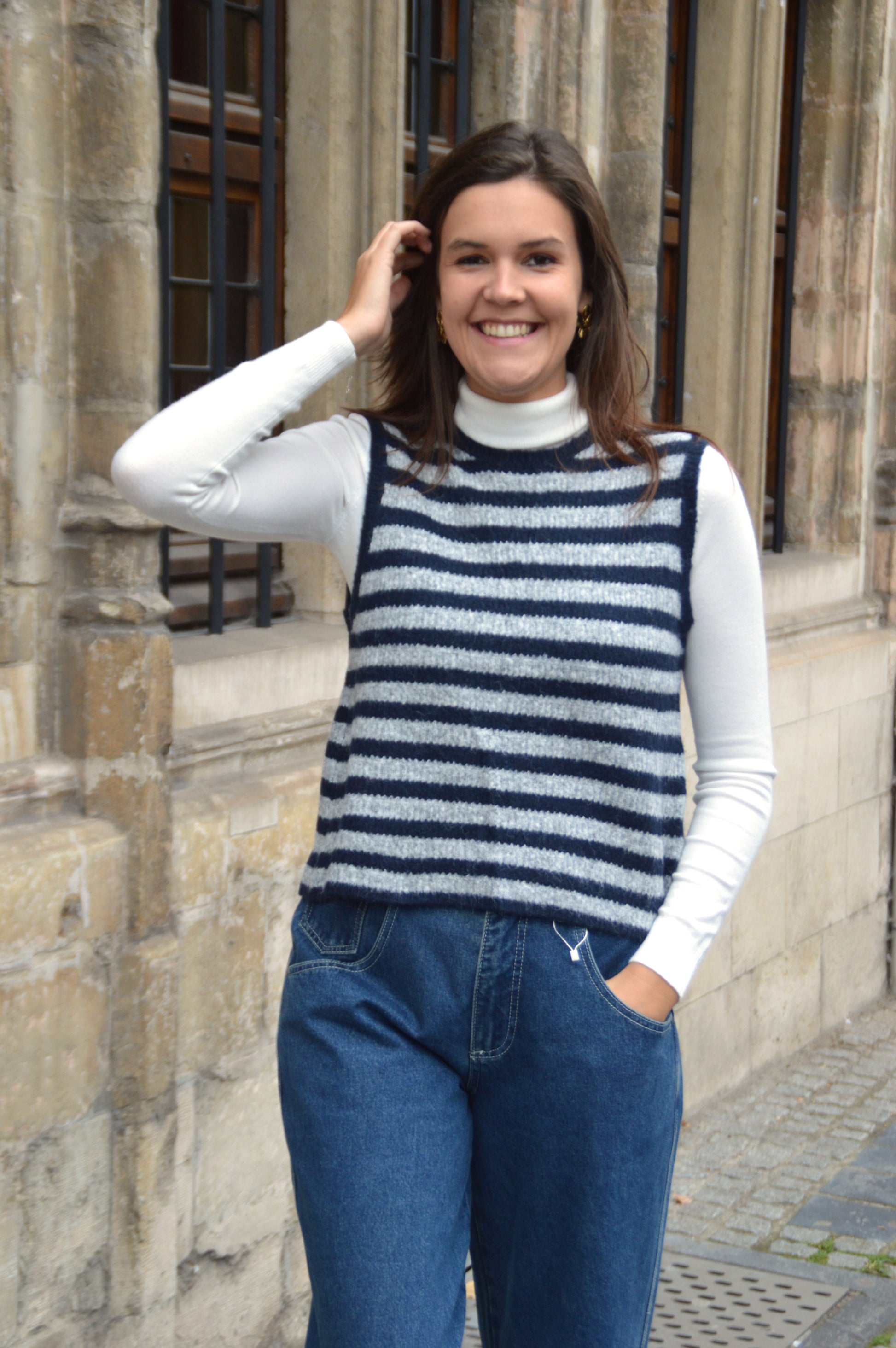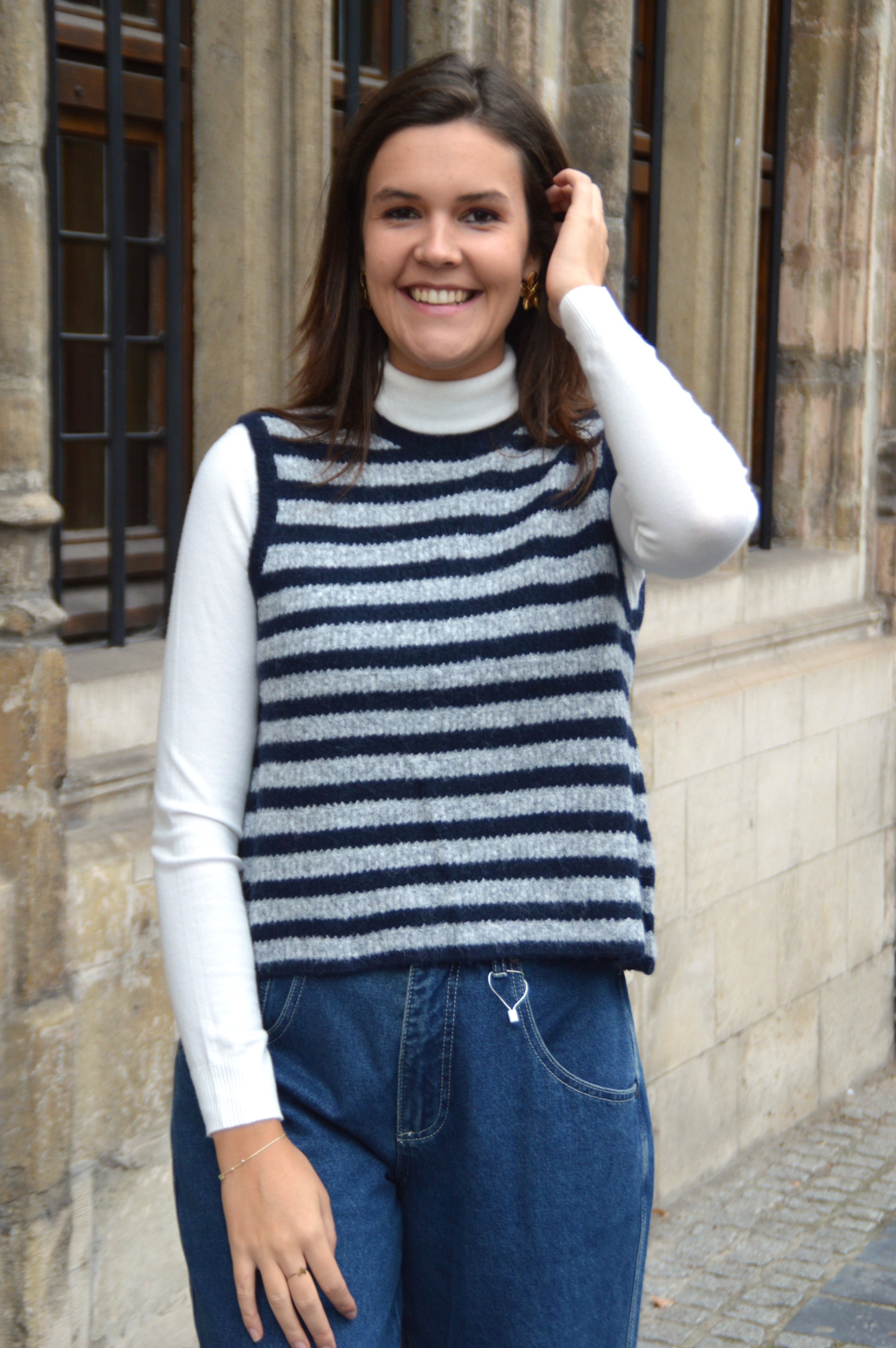 Gestreepte debardeur met open rug. De debardeur heeft blauwe en grijze strepen en sluit achteraan met 2 strikjes.