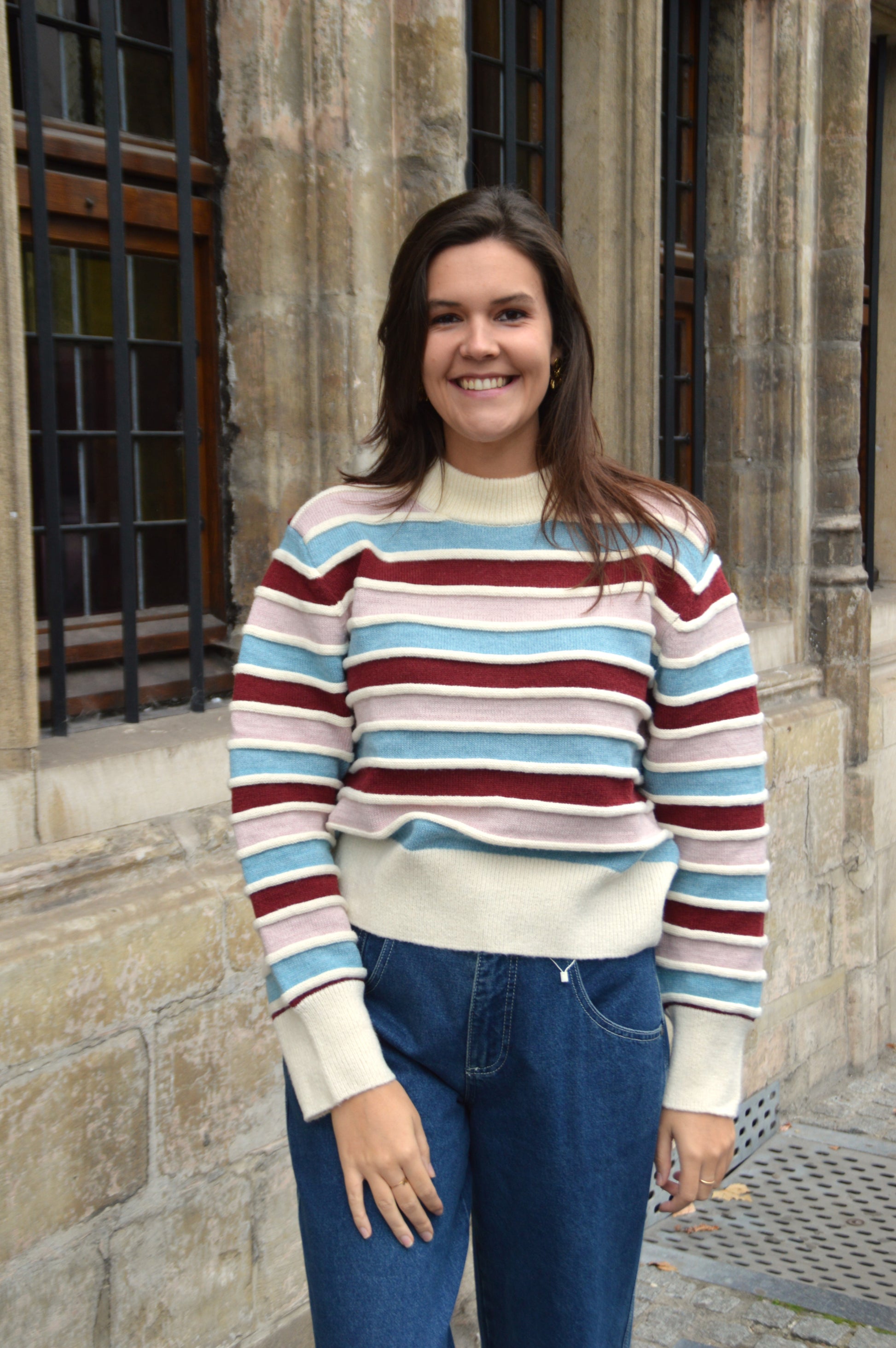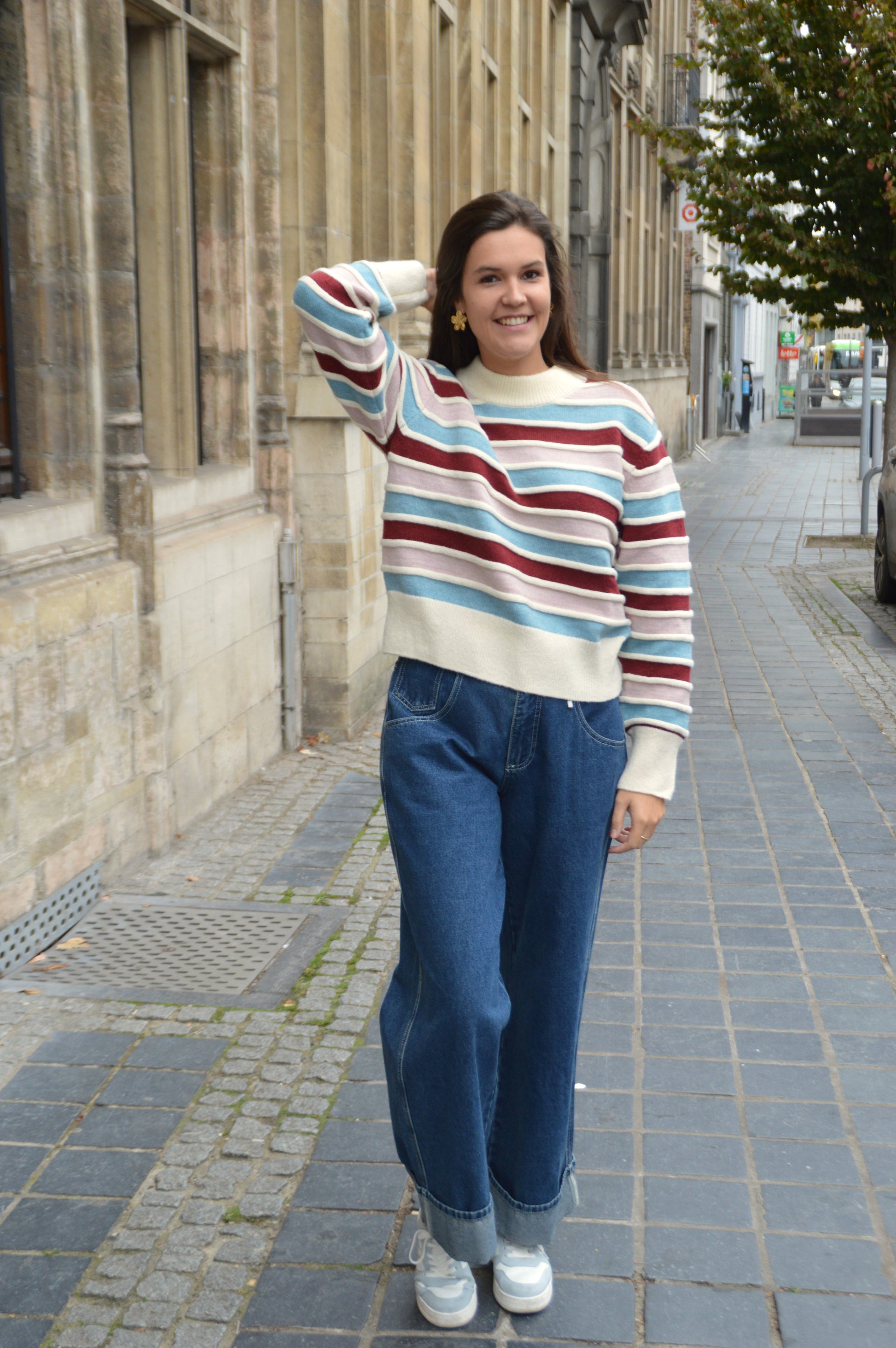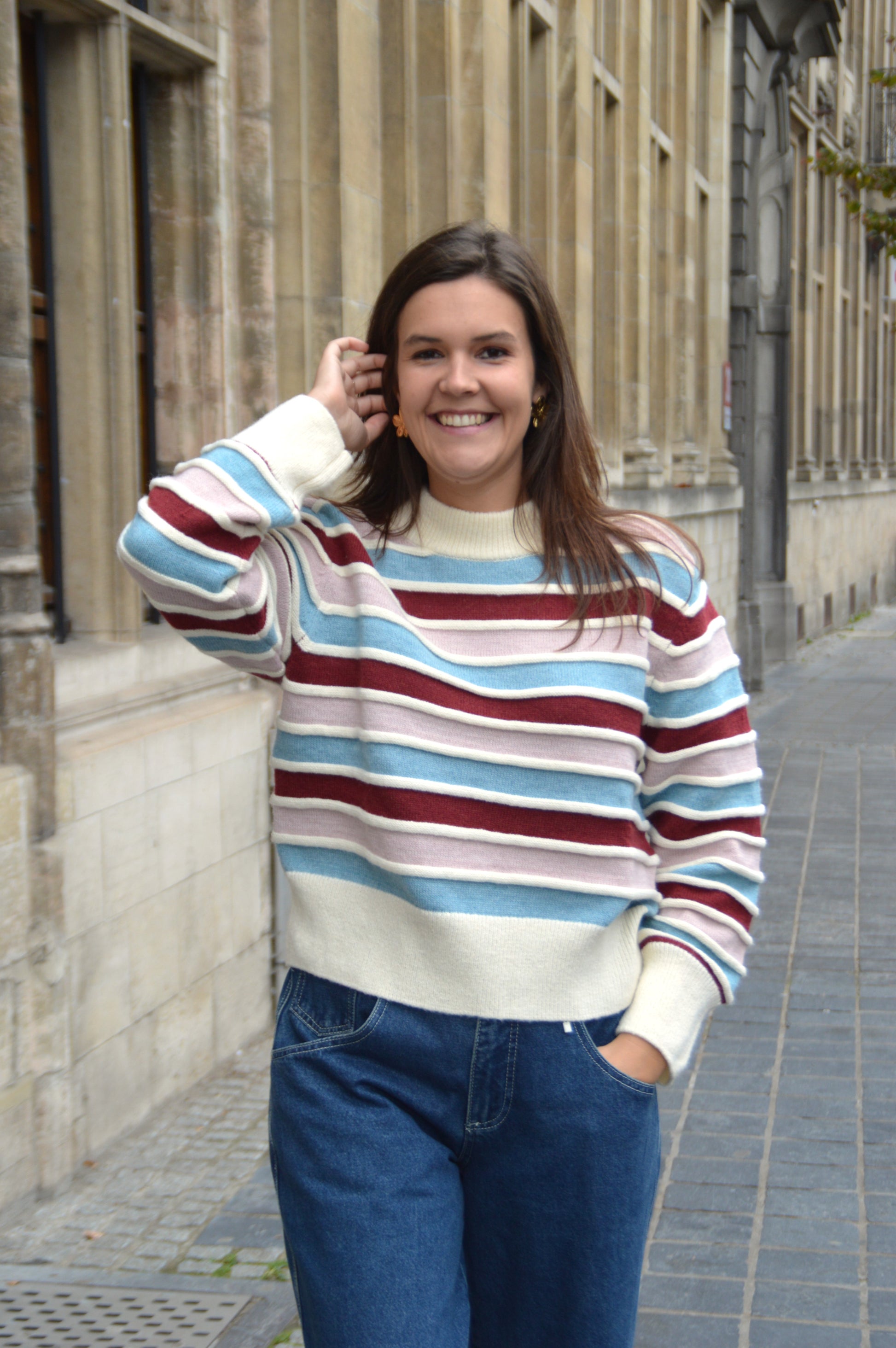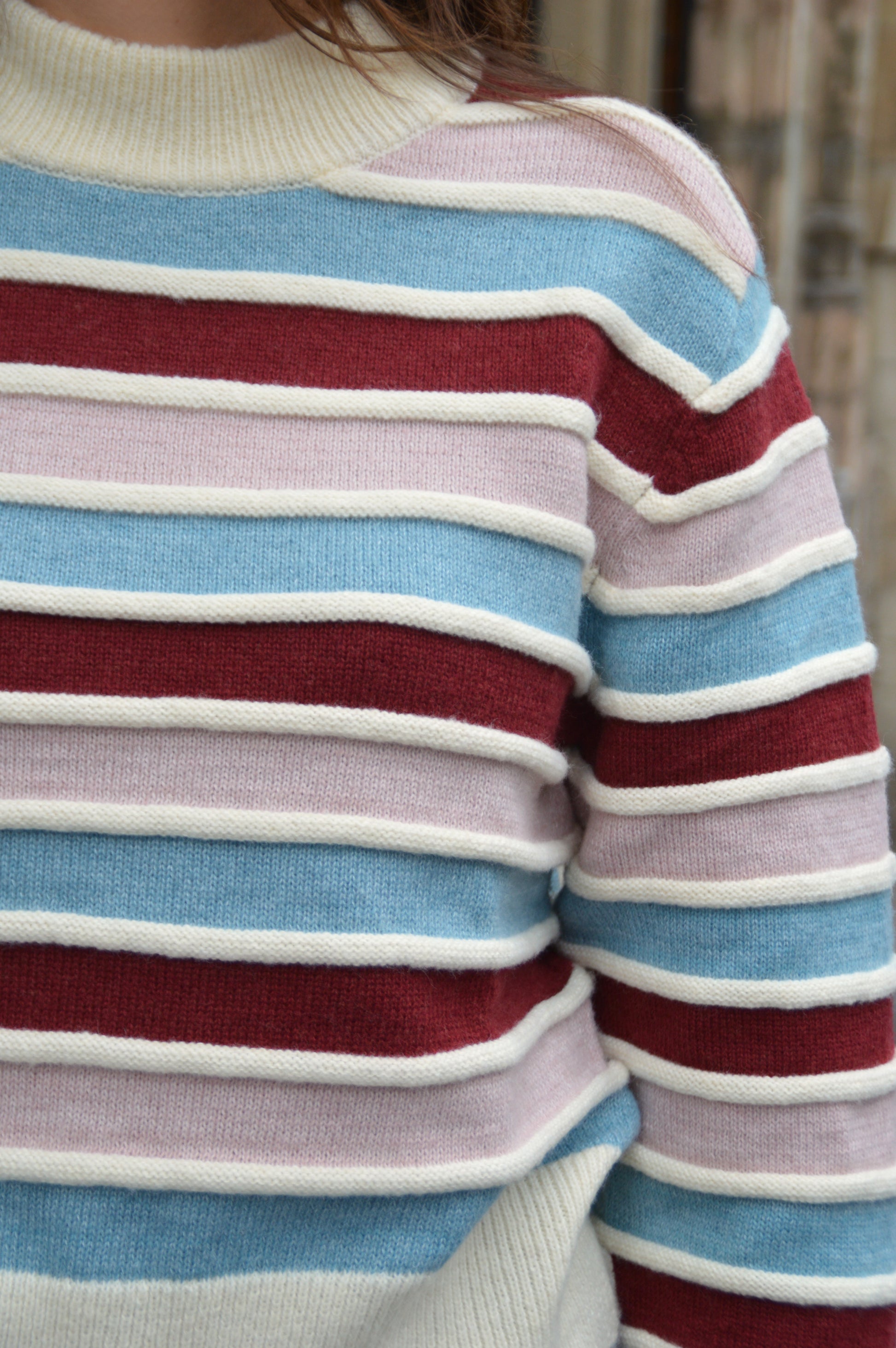 Gestreepte trui met lichtblauw, wit, roze en bordeaux.