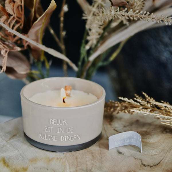Op de geurkaars staat 'Geluk zit in de kleine dingen'. In de wax vind je een flesje met daarin een briefje. Voordat je de kaars brandt kan je het flesje uit de wax trekken, de kurk van het flesje en het briefje eruit halen. Op het briefje staat 'Voor jou heb ik hier een klavertje vier '. Een mooi cadeau voor iemand die je geluk wilt wensen.