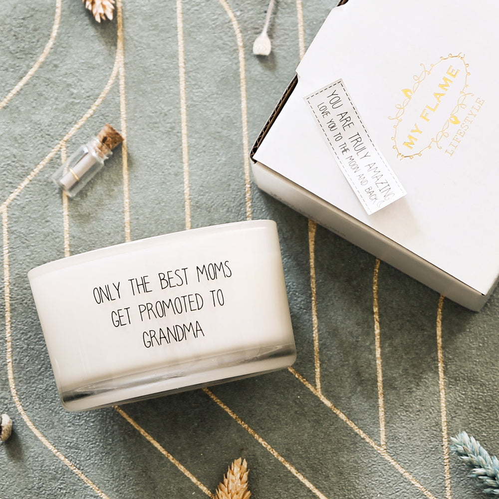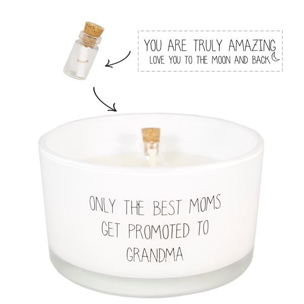 Op de geurkaars staat 'Only the best moms get promoted to grandma'. In de wax vind je een flesje met daarin een briefje. Voordat je de kaars brandt kan je het flesje uit de wax trekken, de kurk van het flesje en het briefje eruit halen. Op het briefje staat 'You are truly amazing. Love you to the moon and back'. Een mooi cadeau met een leuk complimentje.
