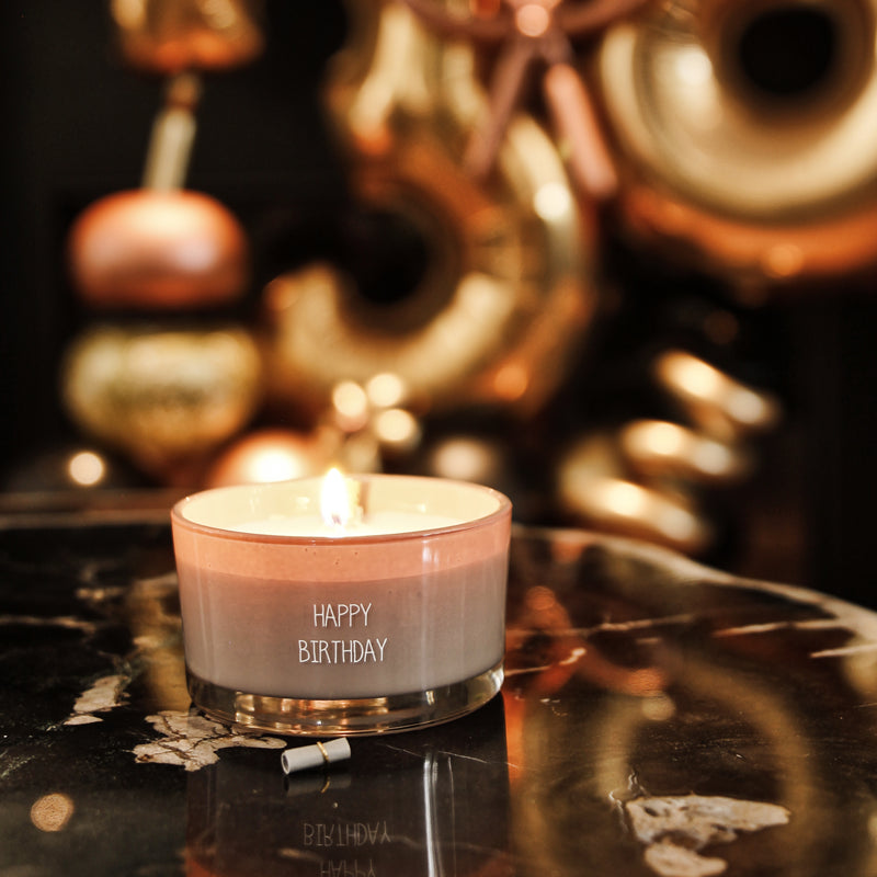 Op de geurkaars staat 'Happy Birthday'. In de wax vind je een flesje met daarin een briefje. Voordat je de kaars brandt kan je het flesje uit de wax trekken, de kurk van het flesje en het briefje eruit halen. Op het briefje staat 'People your age look so much older'. Een mooi cadeau met een leuk complimentje voor de jarige.