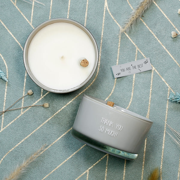 Op de geurkaars staat 'Thank you so much!'. In de wax vind je een flesje met daarin een briefje. Voordat je de kaars brandt kan je het flesje uit de wax trekken, de kurk van het flesje en het briefje eruit halen. Op het briefje staat 'You are the best'. Een mooi cadeau met een leuk complimentje.