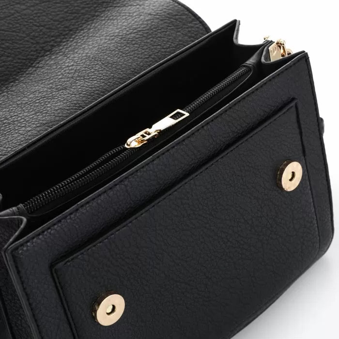 Blauw schoudertasje. Het tasje heeft drukknopen en is in 3 compartimenten (het middelste sluit met een rits) verdeeld. In de tas zitten 2 schouderriemen: eentje met motief (zie eerste foto) en eentje effen in hetzelfde kleur van de tas. Je kan dus makkelijk wisselen afhankelijk van je outfit!