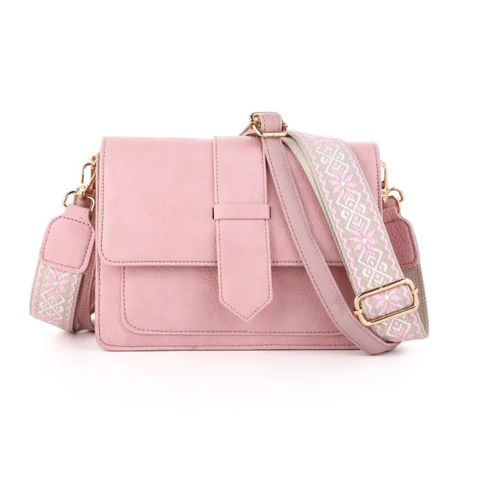 Roze schoudertasje. Het tasje heeft drukknopen en is in 3 compartimenten (het middelste sluit met een rits) verdeeld. In de tas zitten 2 schouderriemen: eentje met motief (zie eerste foto) en eentje effen in hetzelfde kleur van de tas. Je kan dus makkelijk wisselen afhankelijk van je outfit!