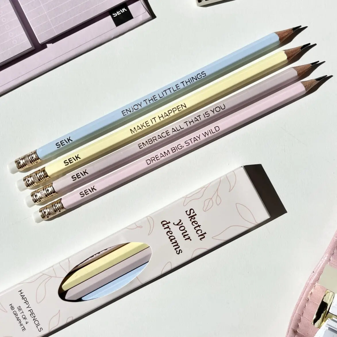 Schets je dromen, schrijf je gedachten op of gebruik ze om aantekeningen te maken - deze potloden zijn je trouwe metgezellen bij het schrijven. Elk potlood heeft een motiverend citaat om je eraan te herinneren positief te blijven en trouw aan jezelf te zijn. Er zitten 4 potloden in de set.