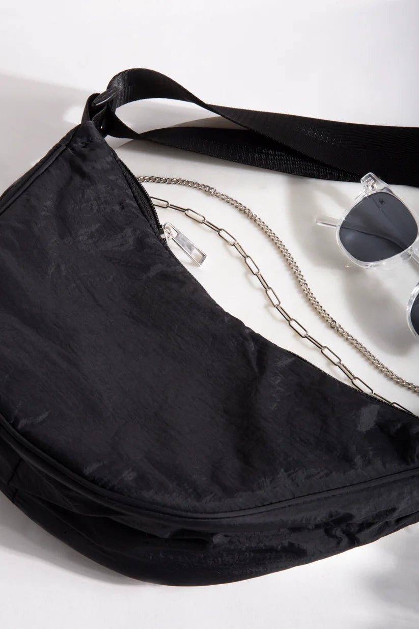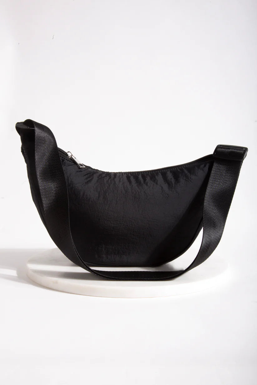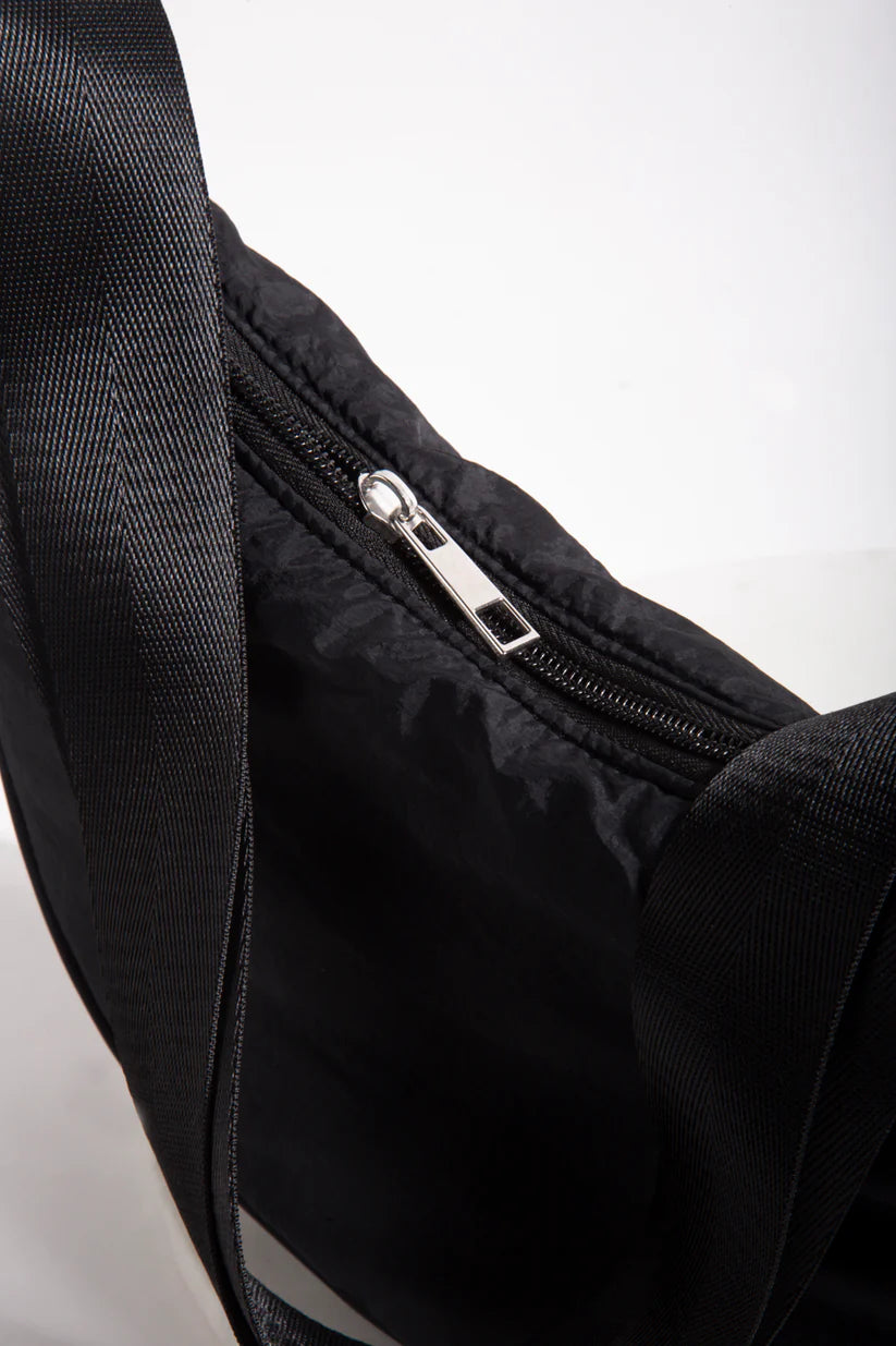 Zwarte schoudertas met ritssluiting en verstelbare schouderband.