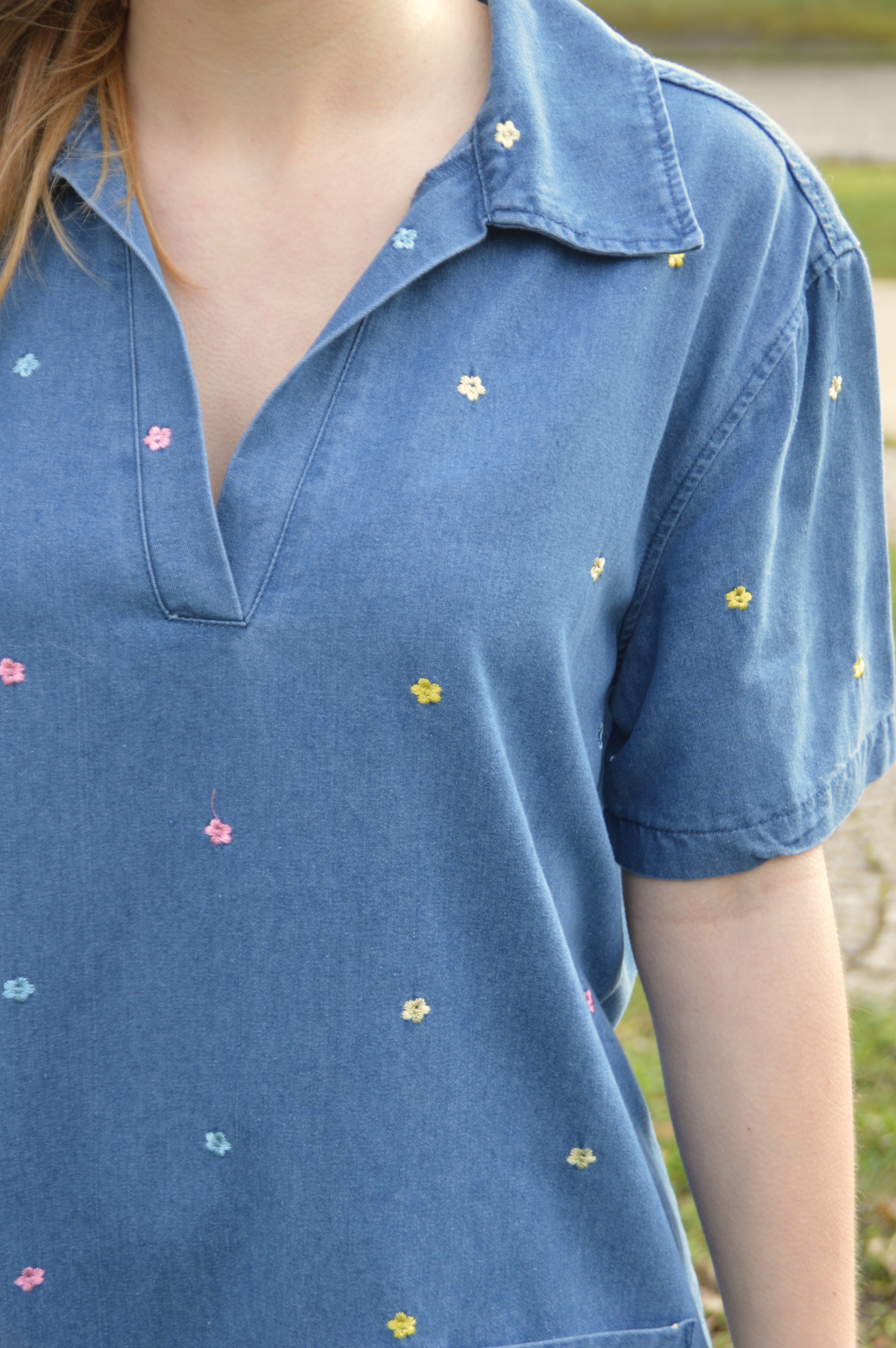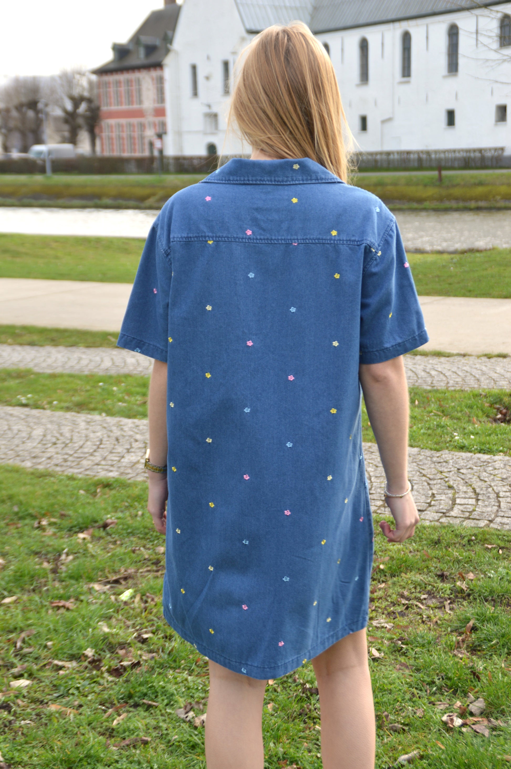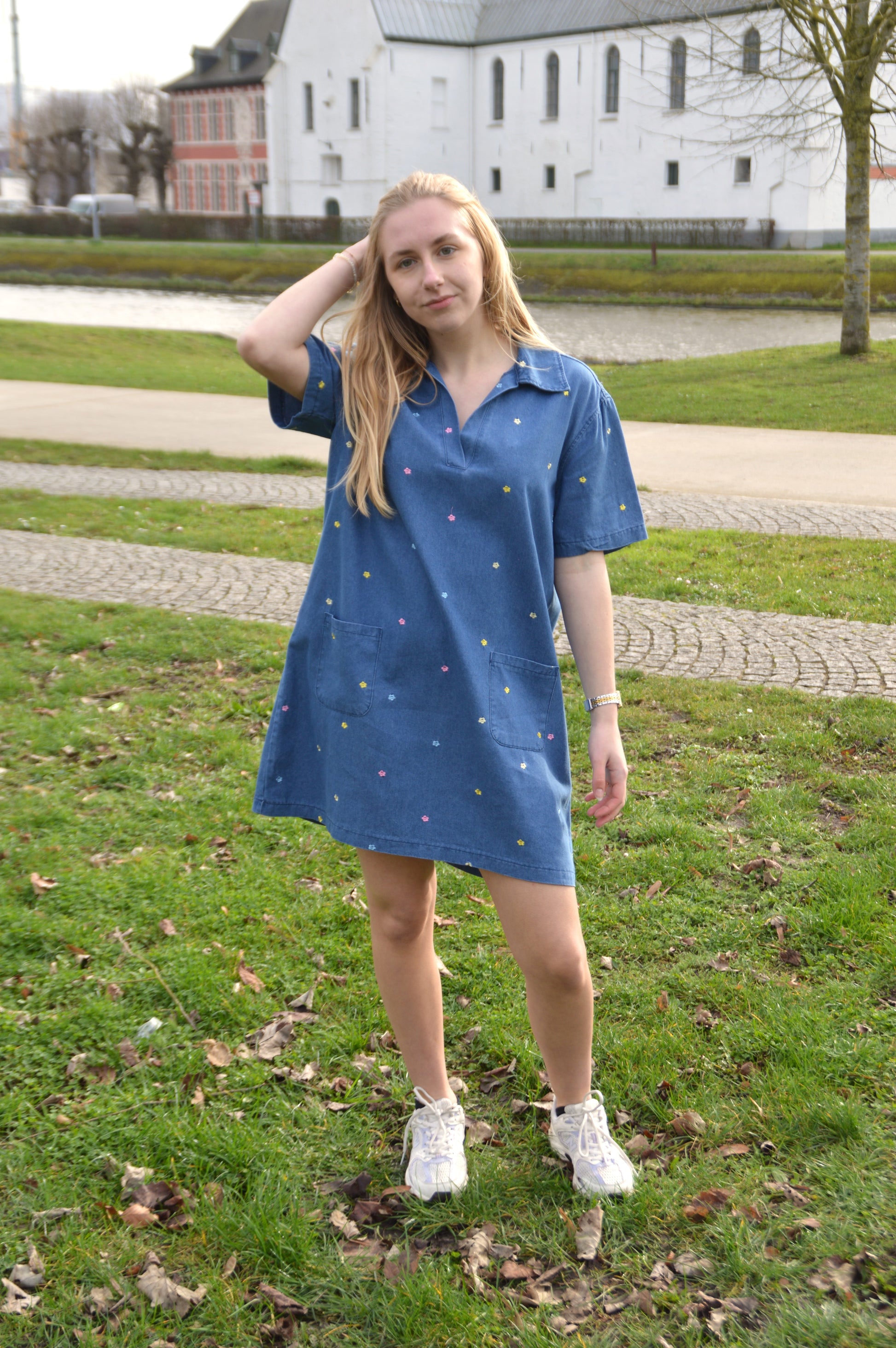 Jeanskleedje met geborduurde bloemetjes (in verschillende kleuren) erop. Het kleedje heeft korte mouwen en zakken.