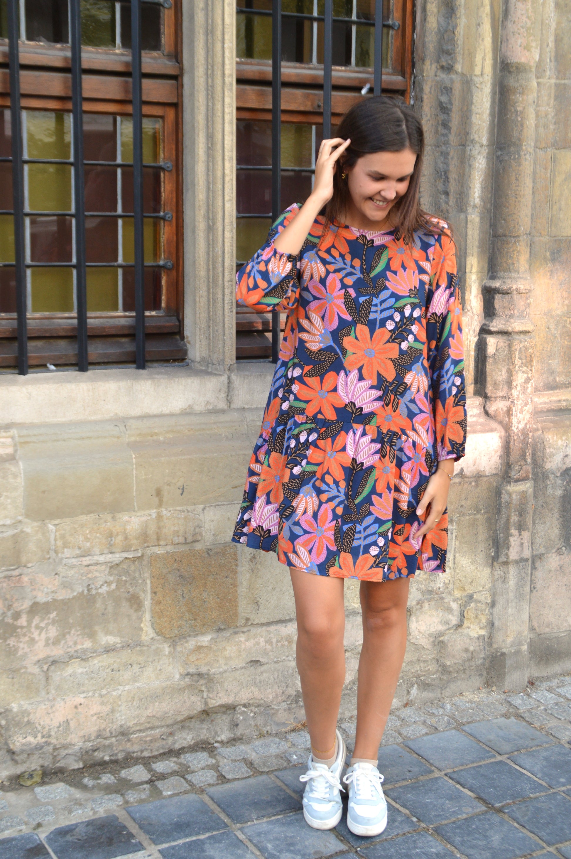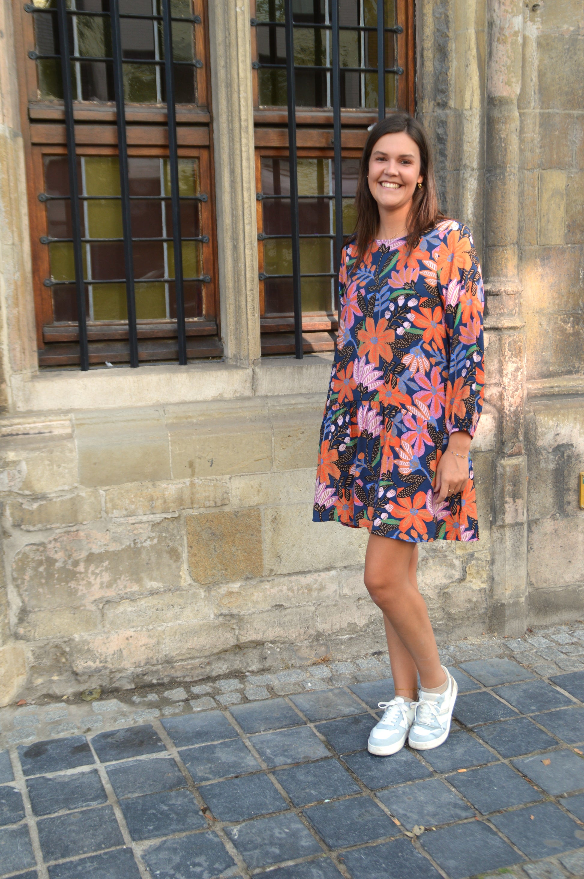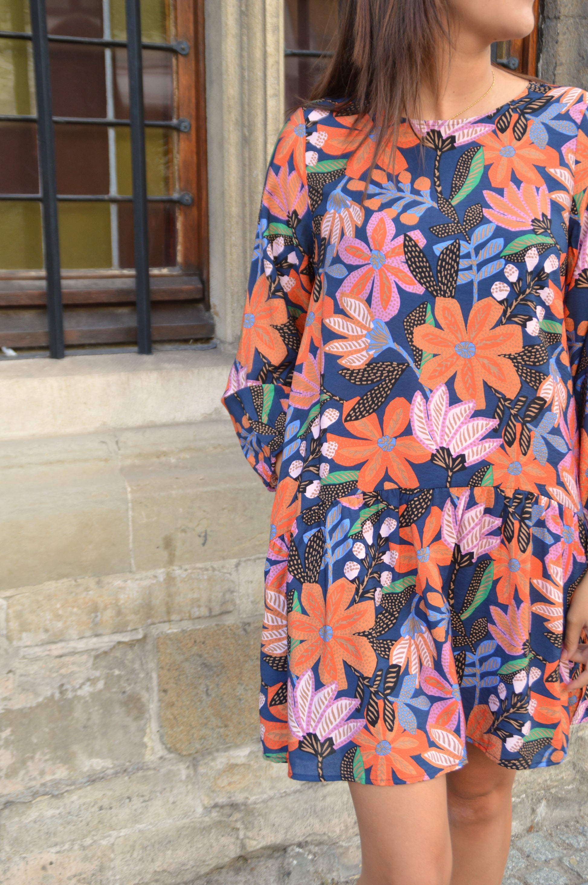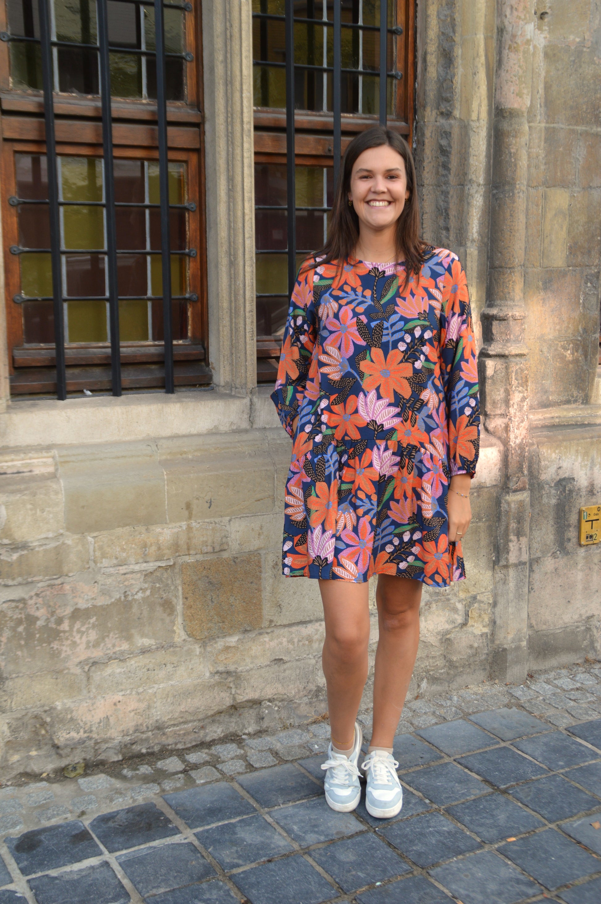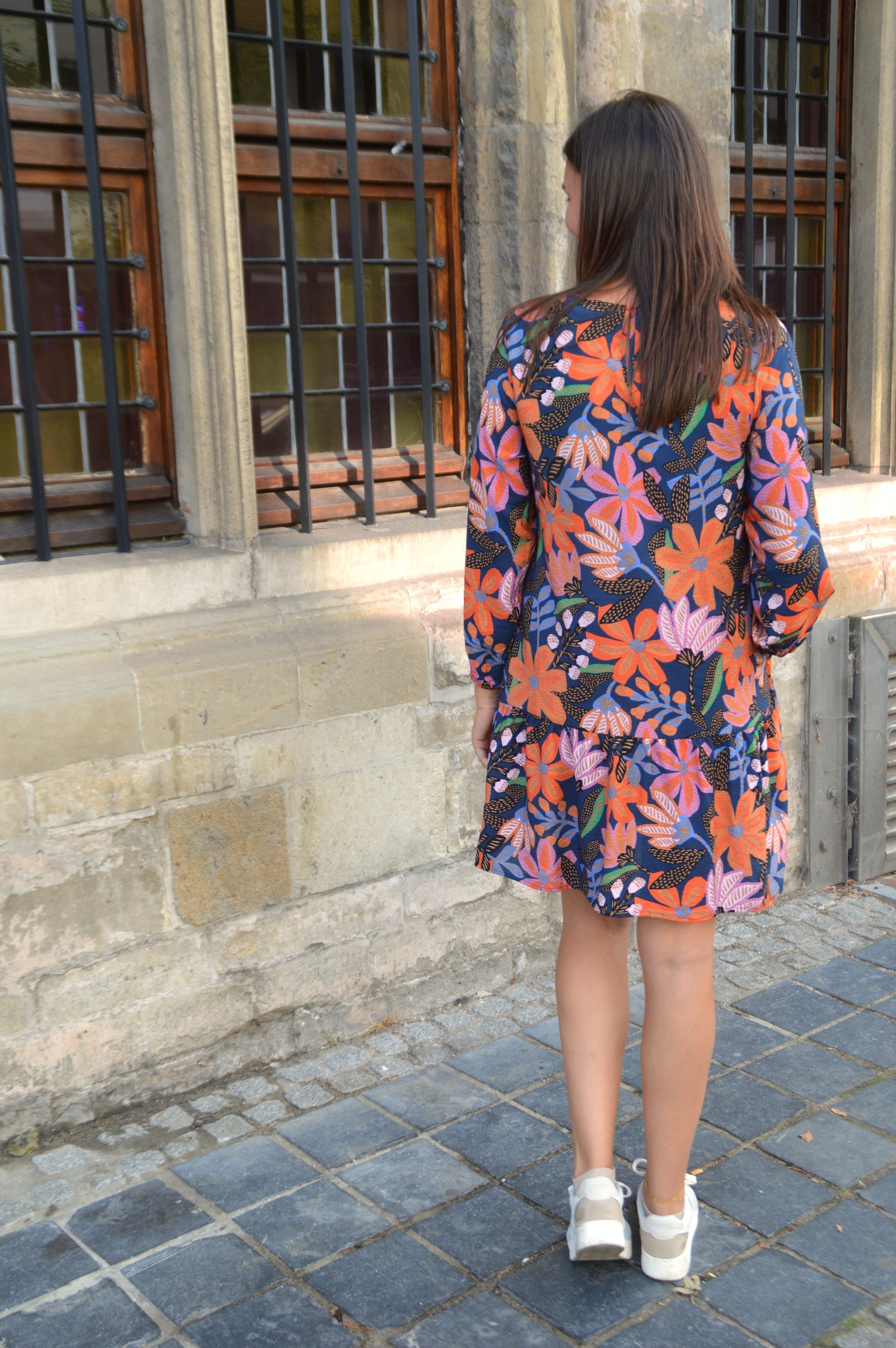 Blauw kleedje met bloemenprint in vrolijke kleuren. Het kleedje heeft lange mouwen en zakken.