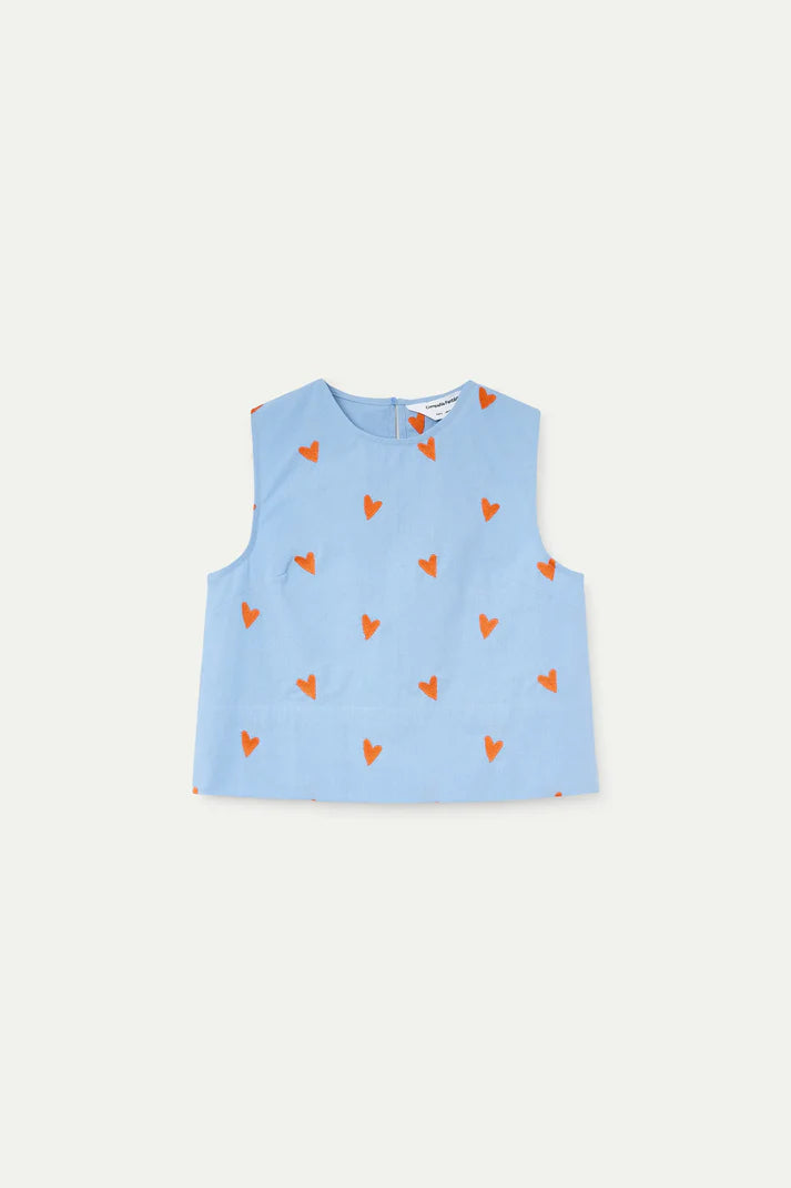 Lichtblauw topje met geborduurde oranje hartjes.