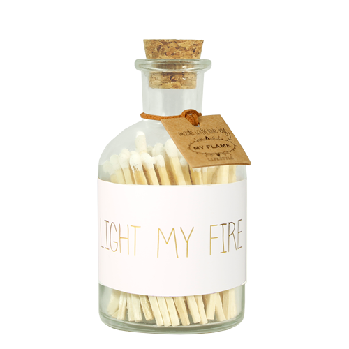 Een glazen potje met 80 witte lucifers. Met deze lucifers ben je helemaal in stijl met een matchende kaars. Het potje wordt gesierd met de tekst 'Light My Fire'.