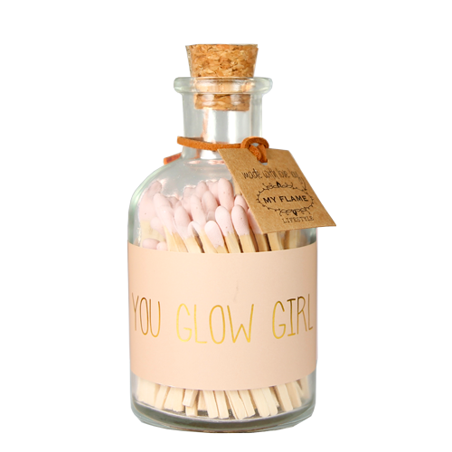 Een glazen potje met 80 roze lucifers. Met deze lucifers ben je helemaal in stijl met een matchende kaars. Het potje wordt gesierd met de tekst 'You Glow Girl'.
