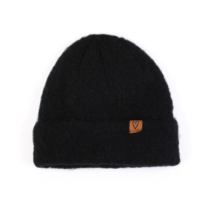 Zachte muts met bruin labeltje waarop een hartje staat.