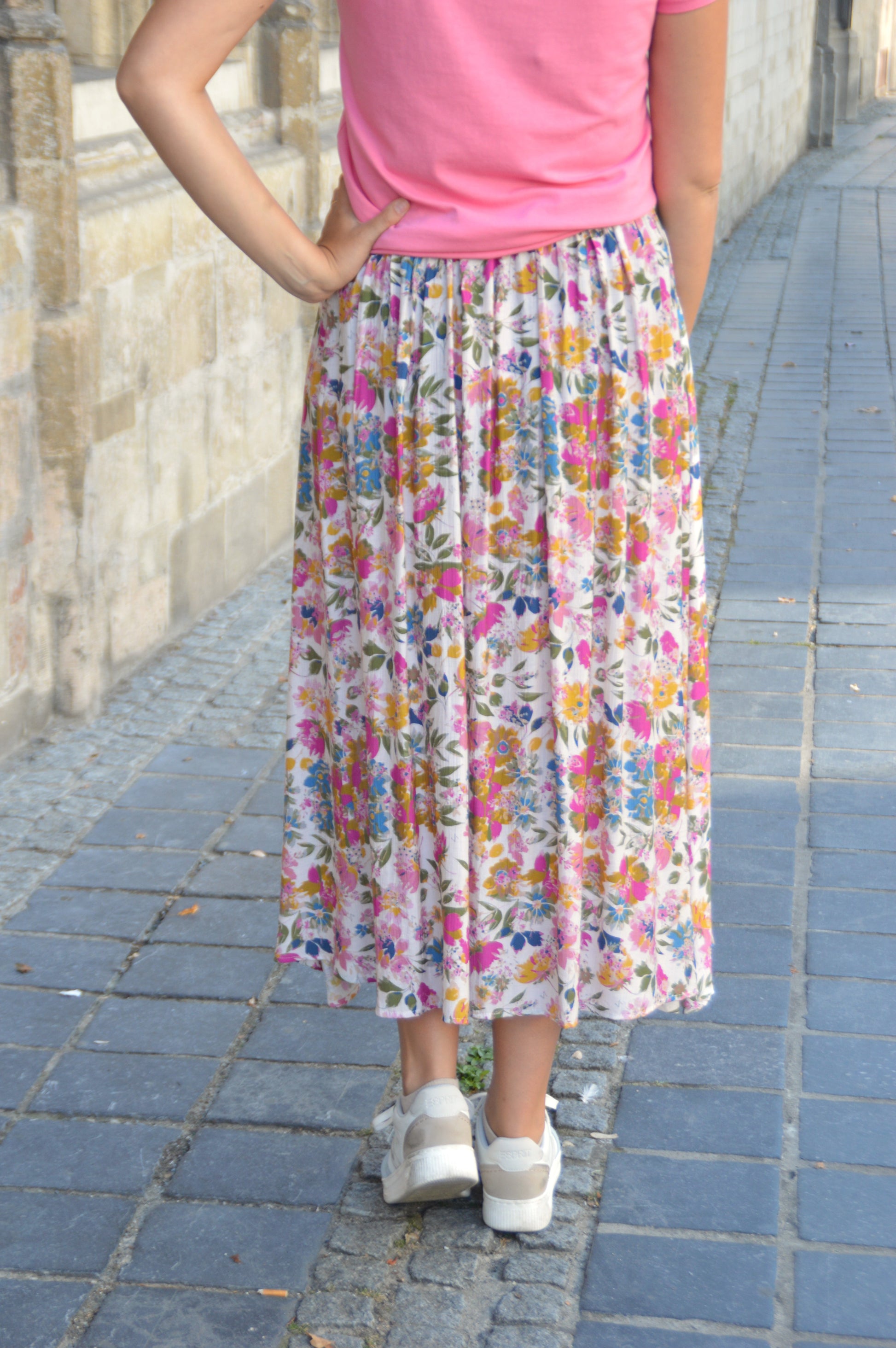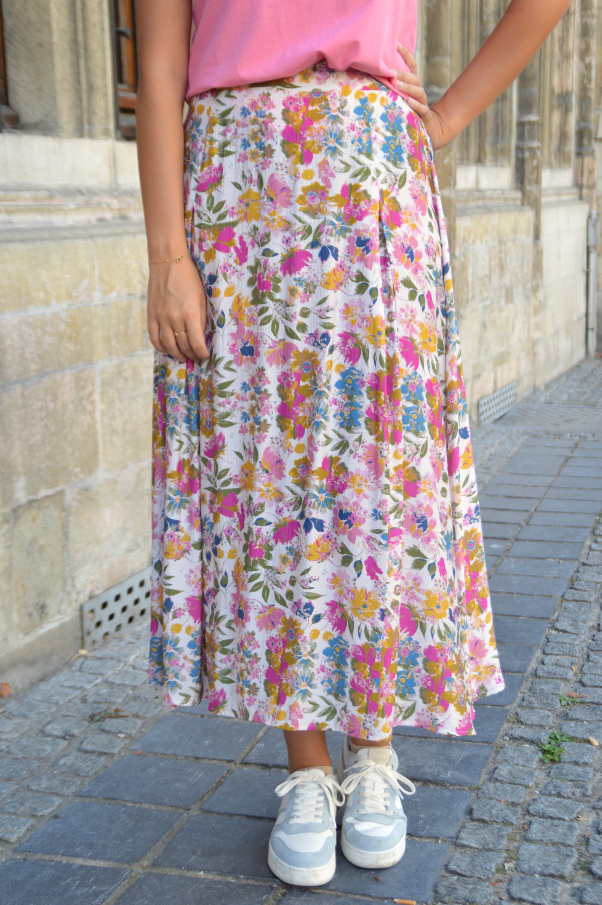 Witte rok met vrolijke bloemenprint. De rok is op rekker en heeft achteraan plooien.