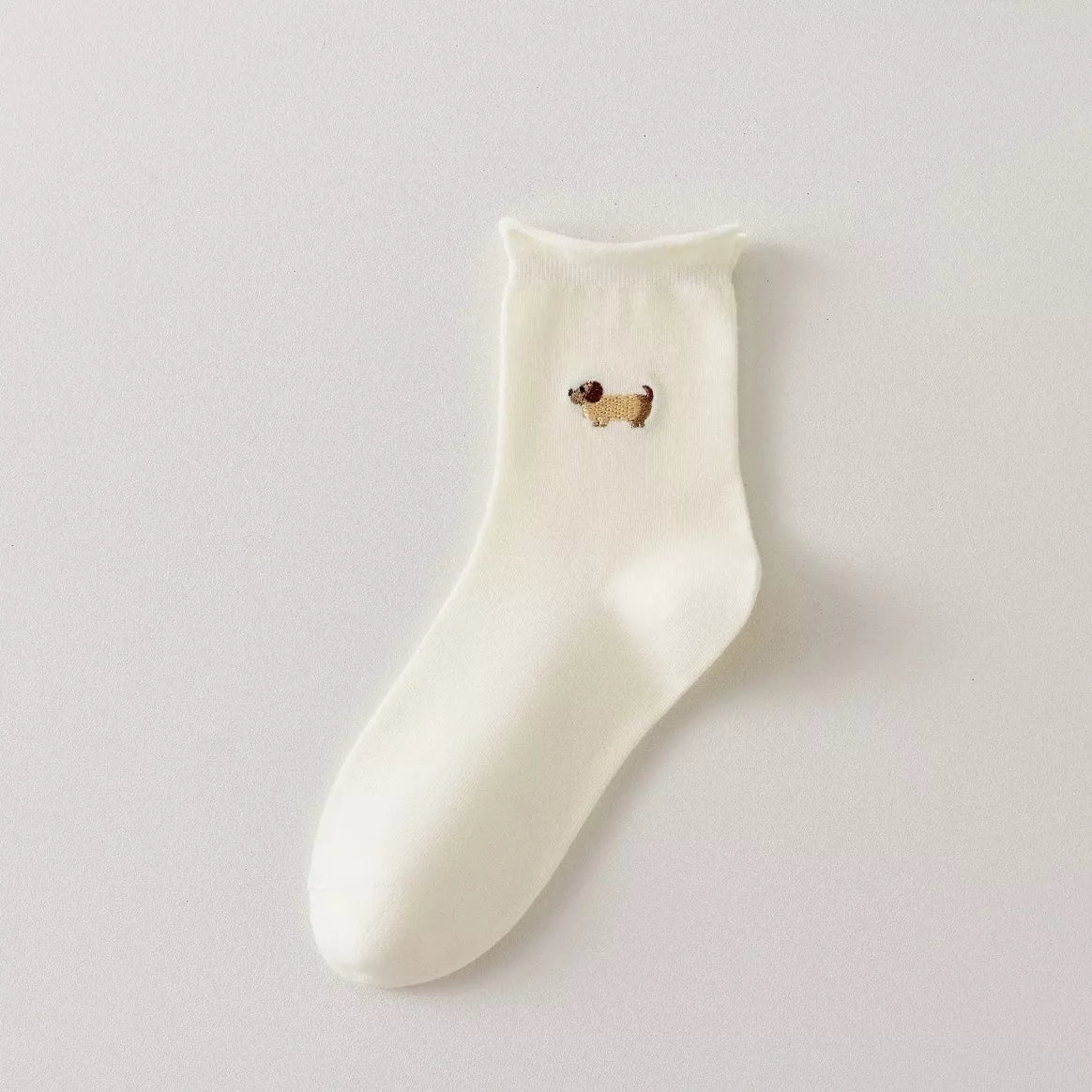 Crèmekleurige damessokken met schattig geborduurd hondje erop.
