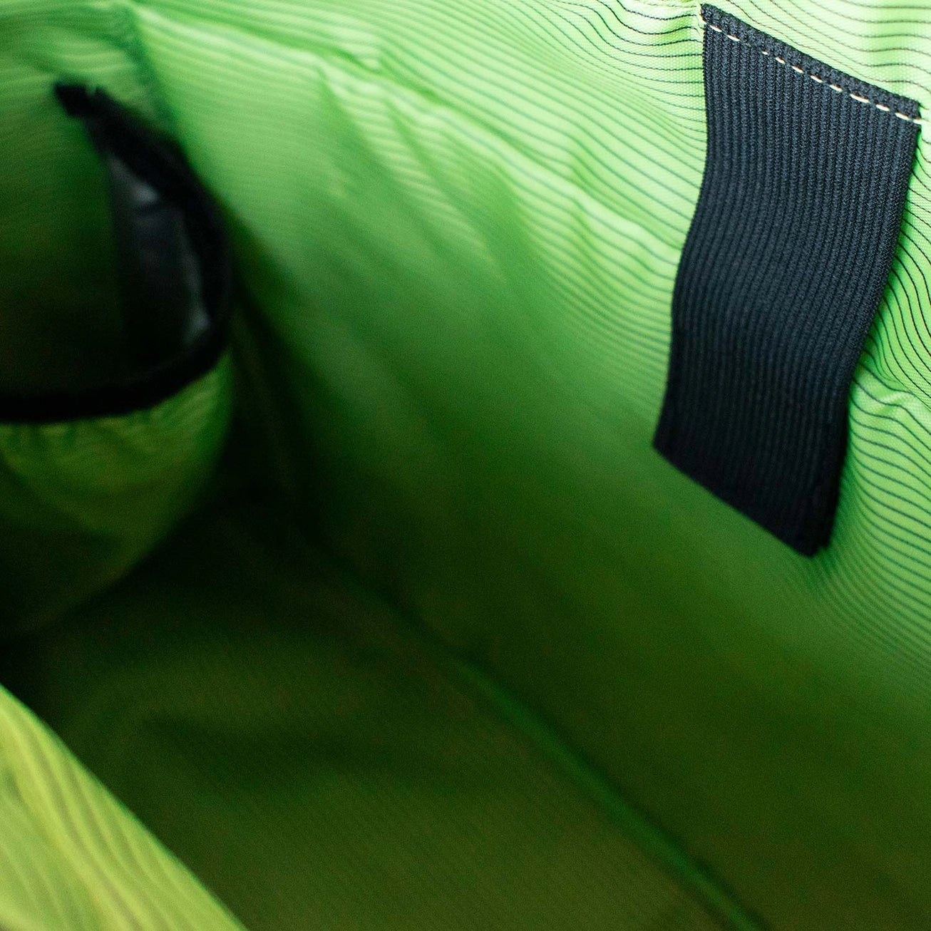 De tas is gemaakt van gerecycleerde stof en is volledig waterdicht. De tas heeft 2 handvaten en een riem die je over je schouder kan dragen. Vooraan is er een voorvak, binnenin is er een vak voor je laptop of tablet en om een fles water in te steken.