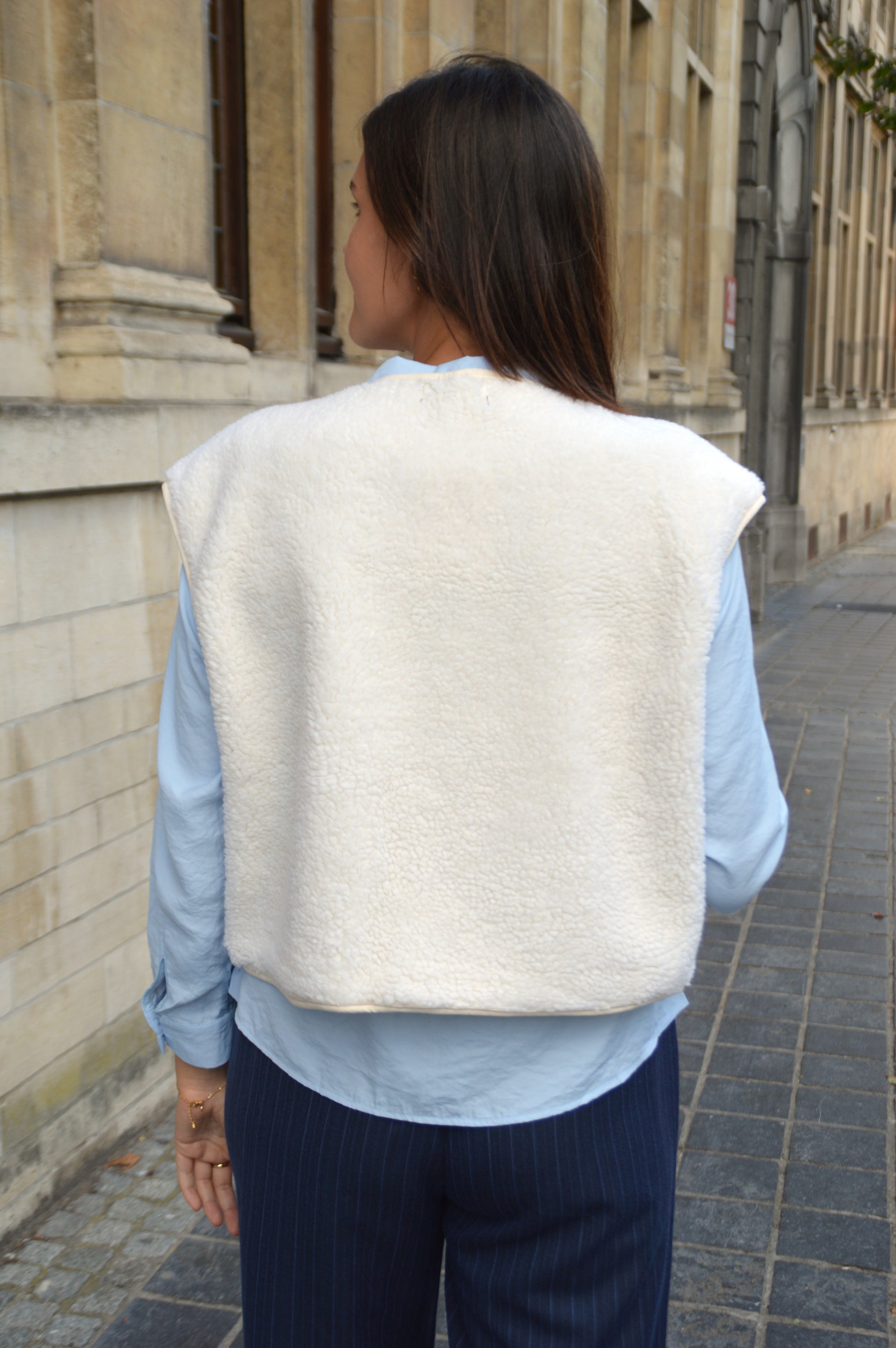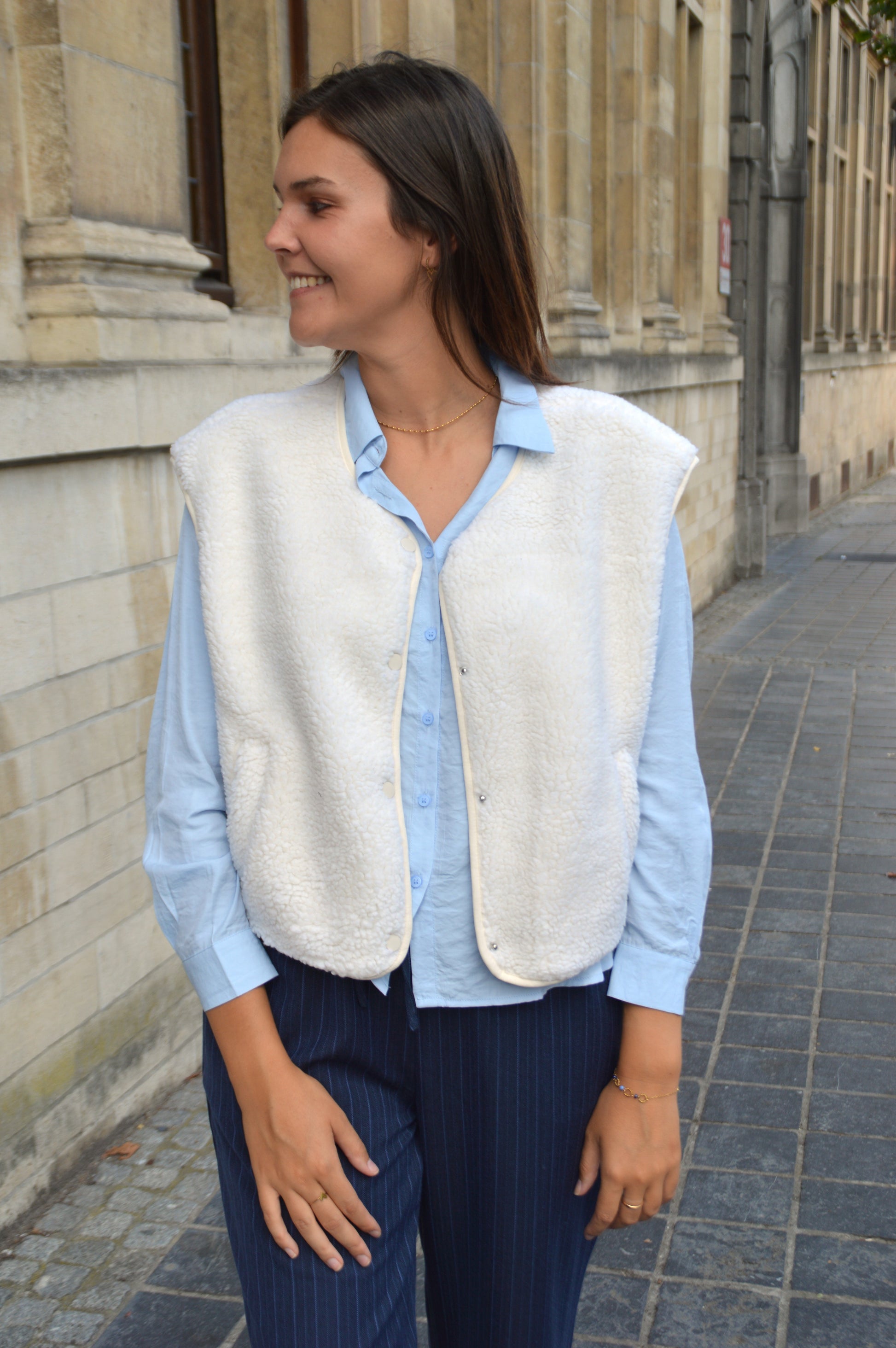 Wit vestje in teddy stof. Het vestje heeft geen mouwen en sluit vooraan met drukknopen.