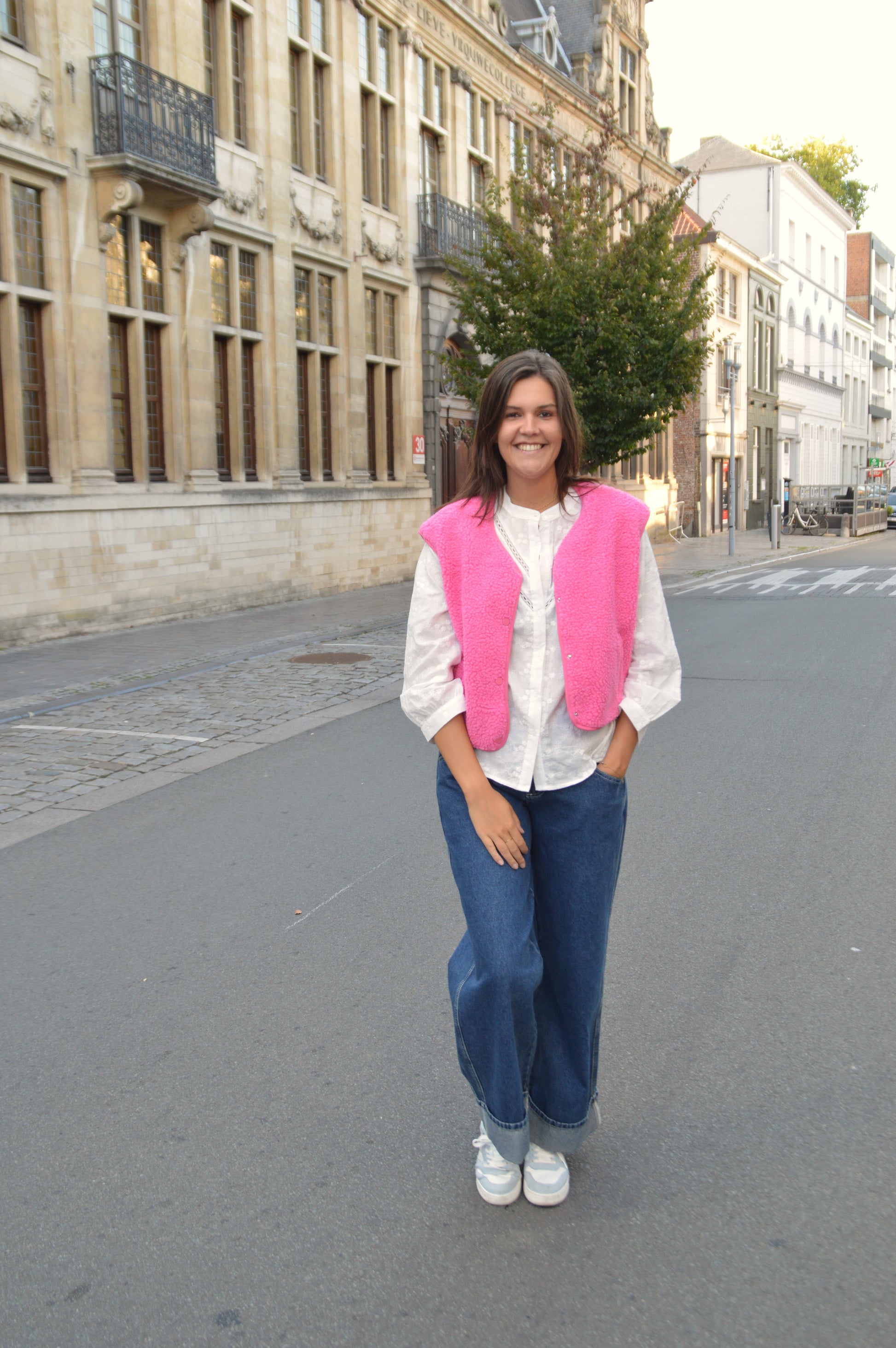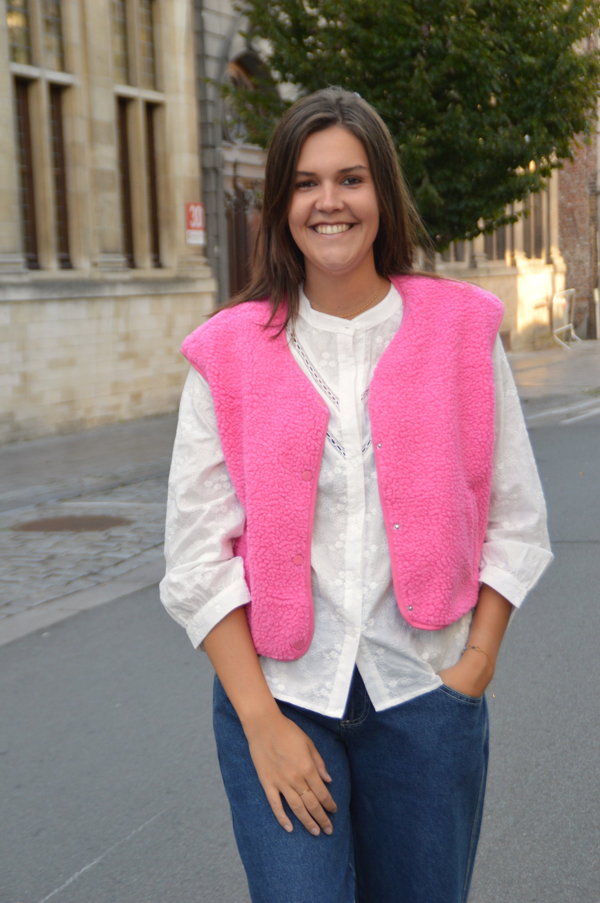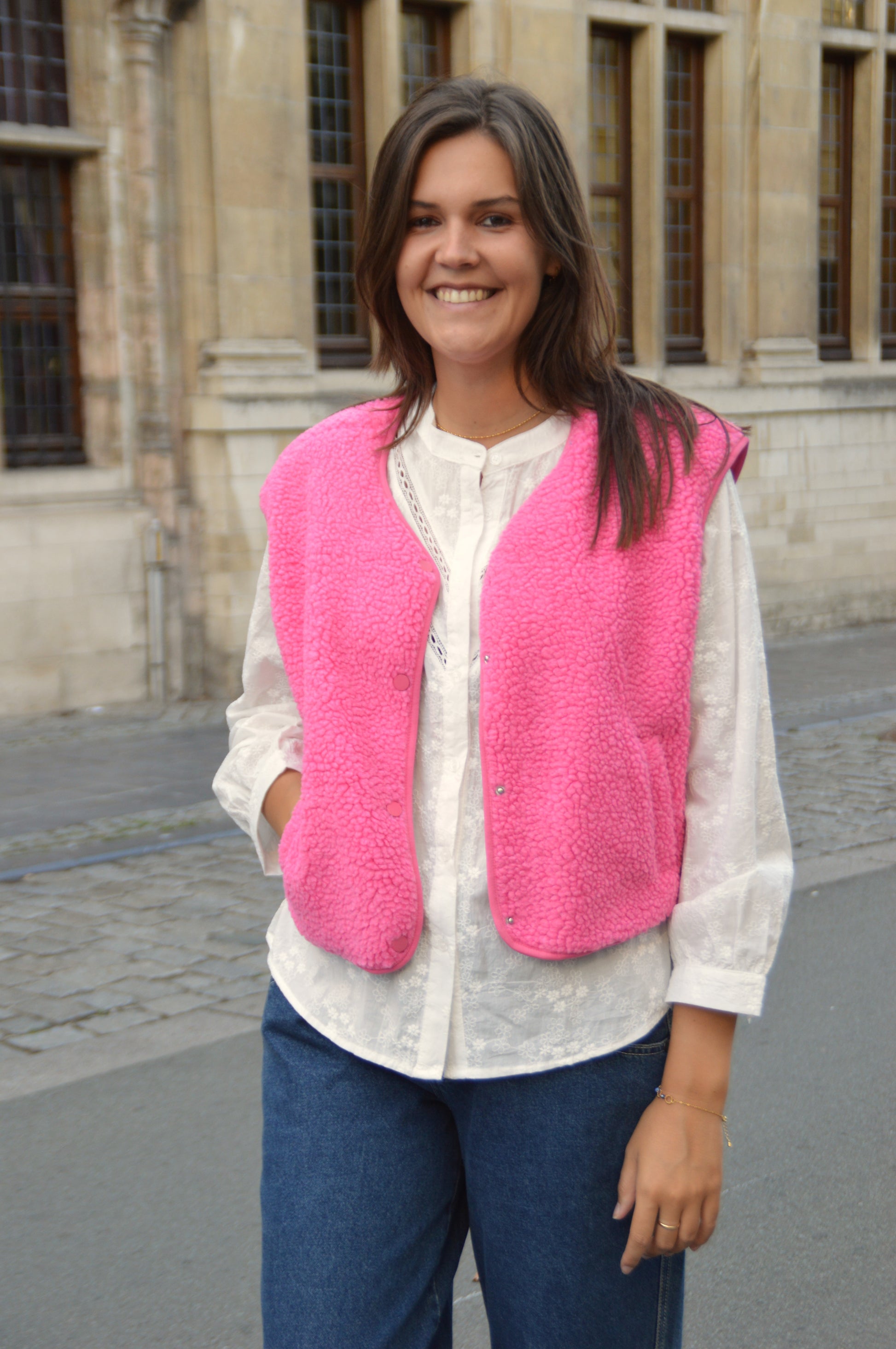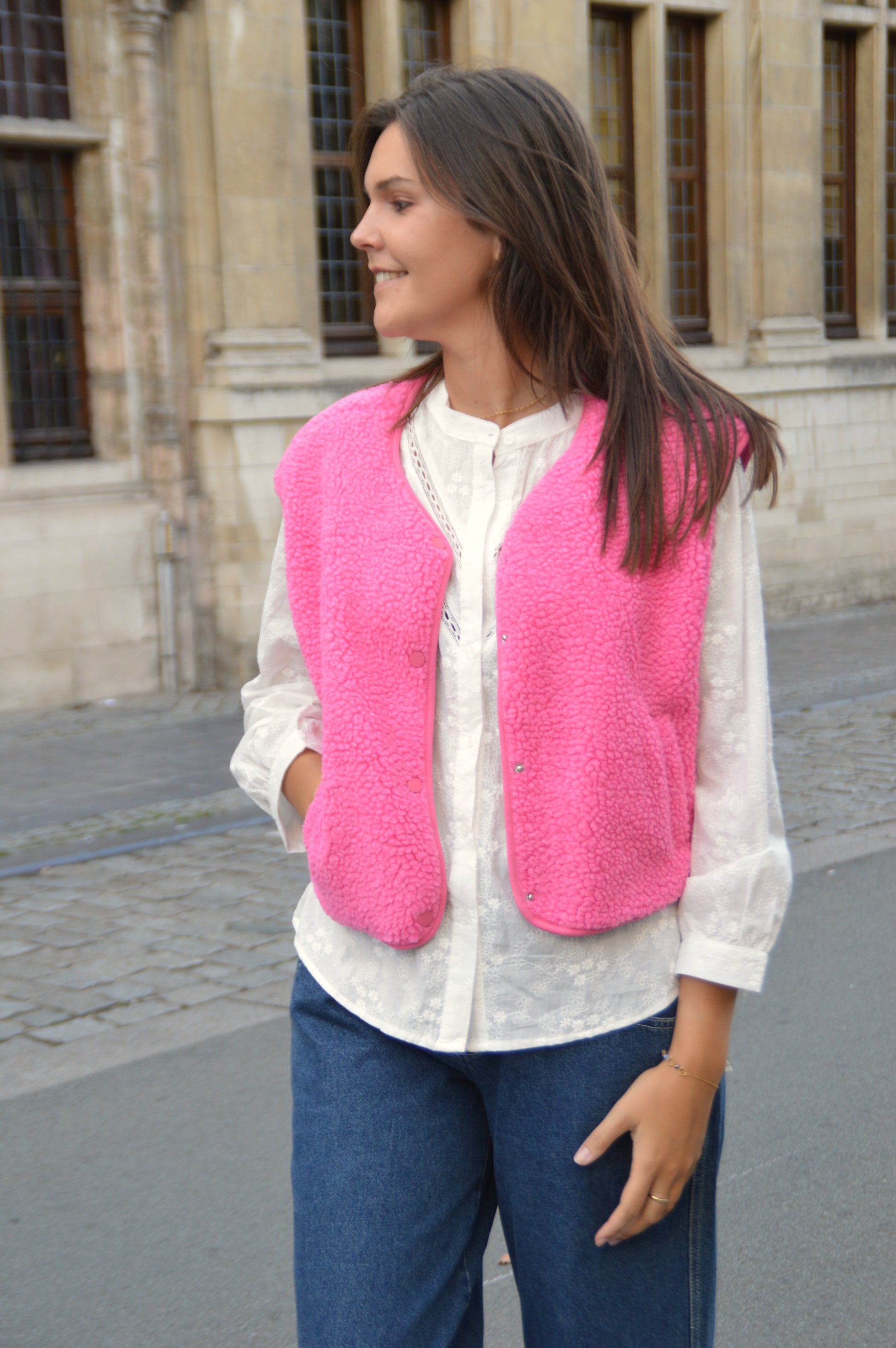 Fuchsia vestje in teddy stof. Het vestje heeft geen mouwen en sluit vooraan met drukknopen.