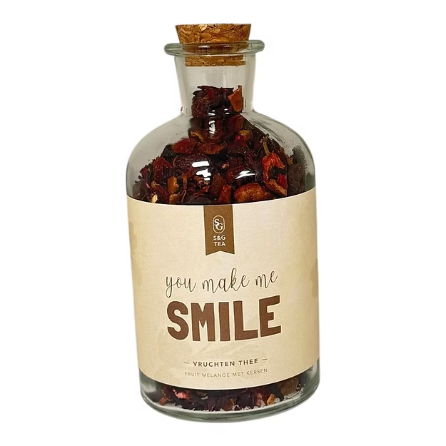 Een glazen flesje met kurk, gevuld met een smaakvolle fruitmelange die de geur en smaak van een zomerse dag oproept. Deze thee combineert de klassieke tonen van hibiscus, rozenbottel en appel met de zoetheid van druiven en de volle smaak van fruitige, zon-gerijpte kersen.