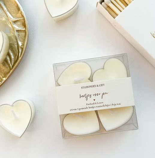 Een lief cadeau, een kleinigheidje maar met grote betekenis! Dit schattige doosje heeft 4 waxinelichtjes in de vorm van een hartje. De waxinehartjes hebben een heerlijke geur: Patchouli & Lemon en zijn gemaakt van soja.