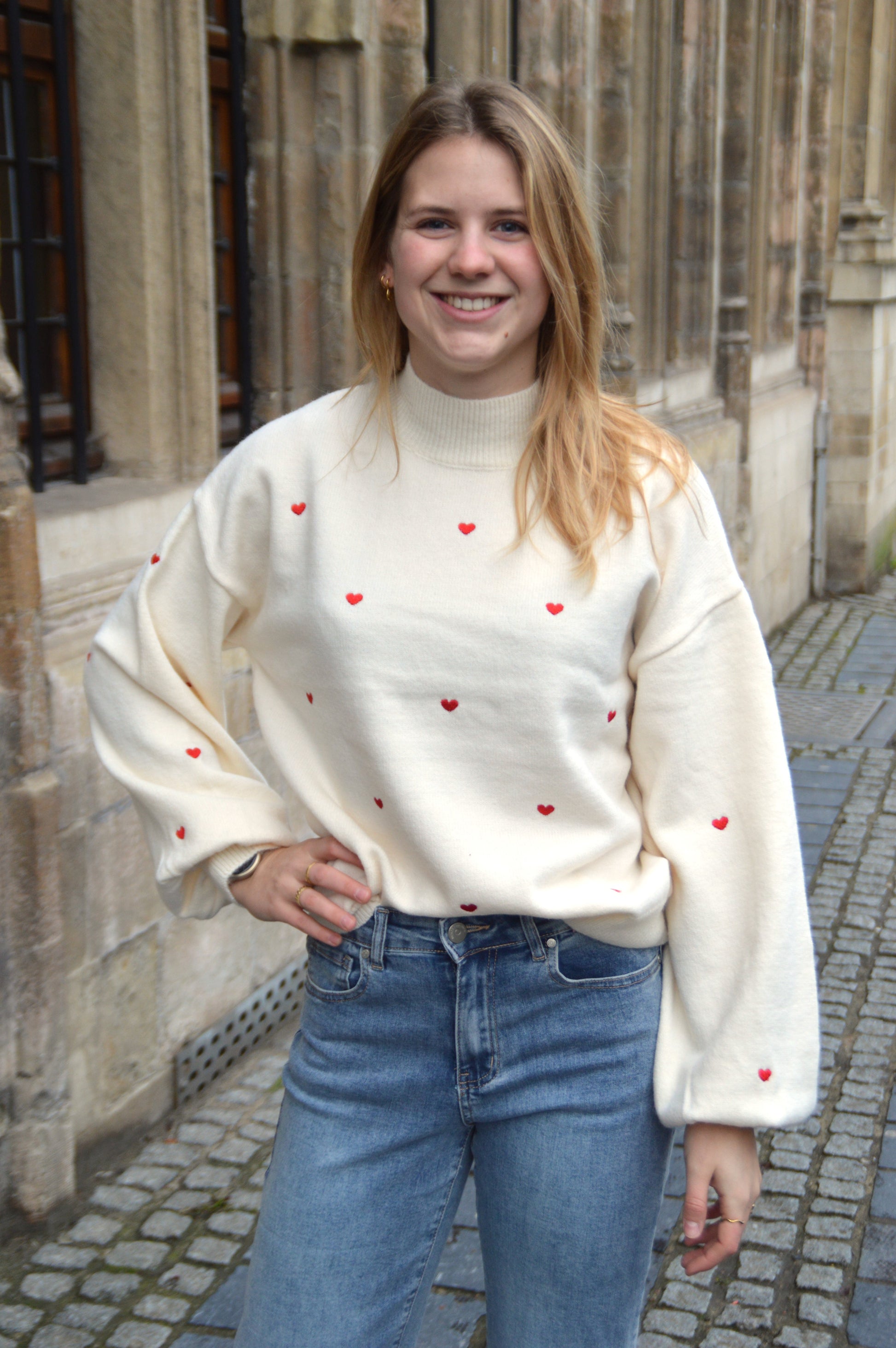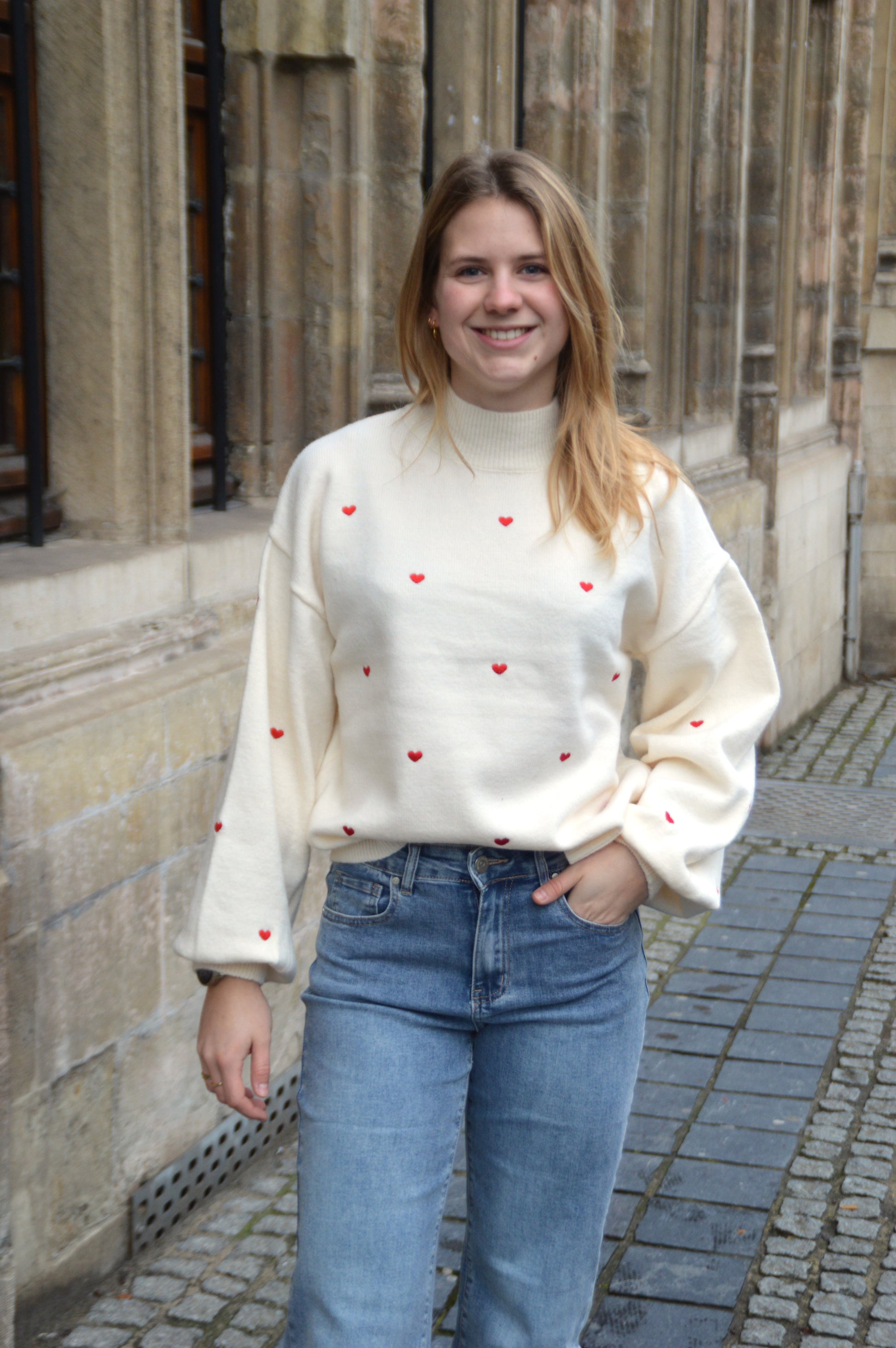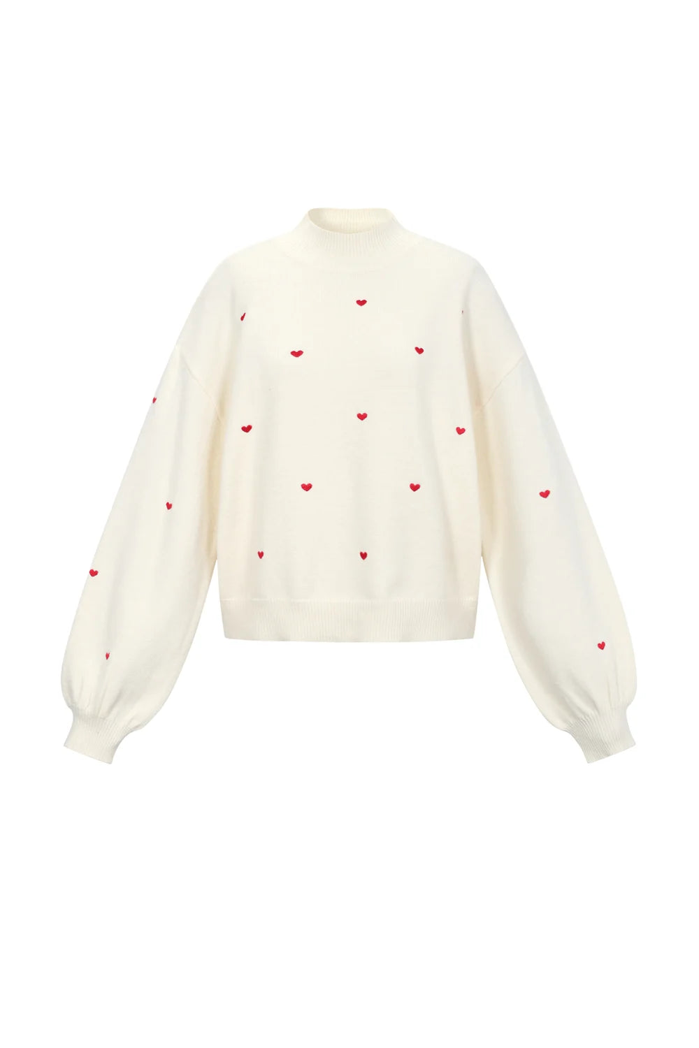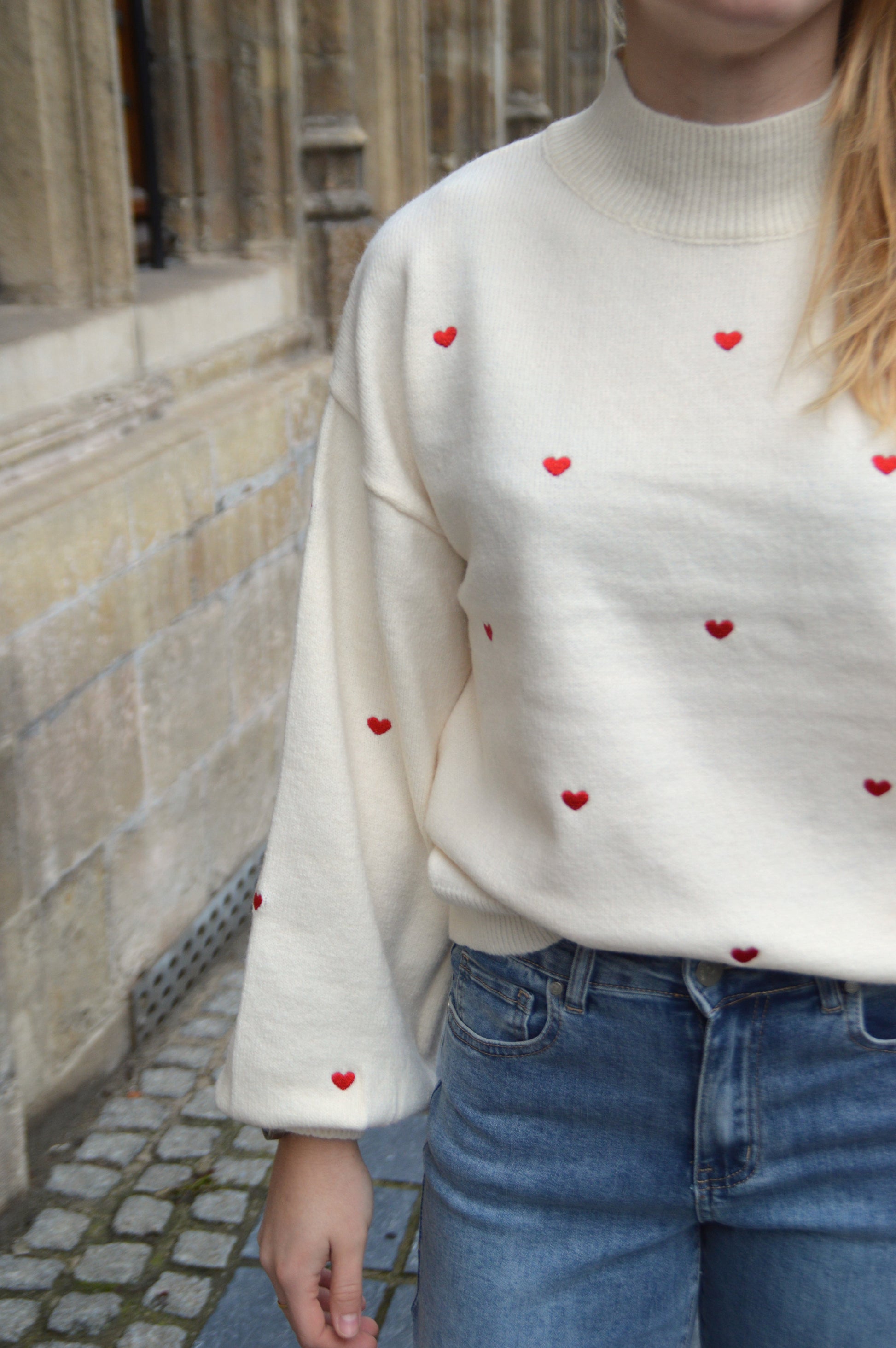 Wit gebreide trui met geborduurde rode hartjes. De trui heeft een kraagje en pofmouwen.